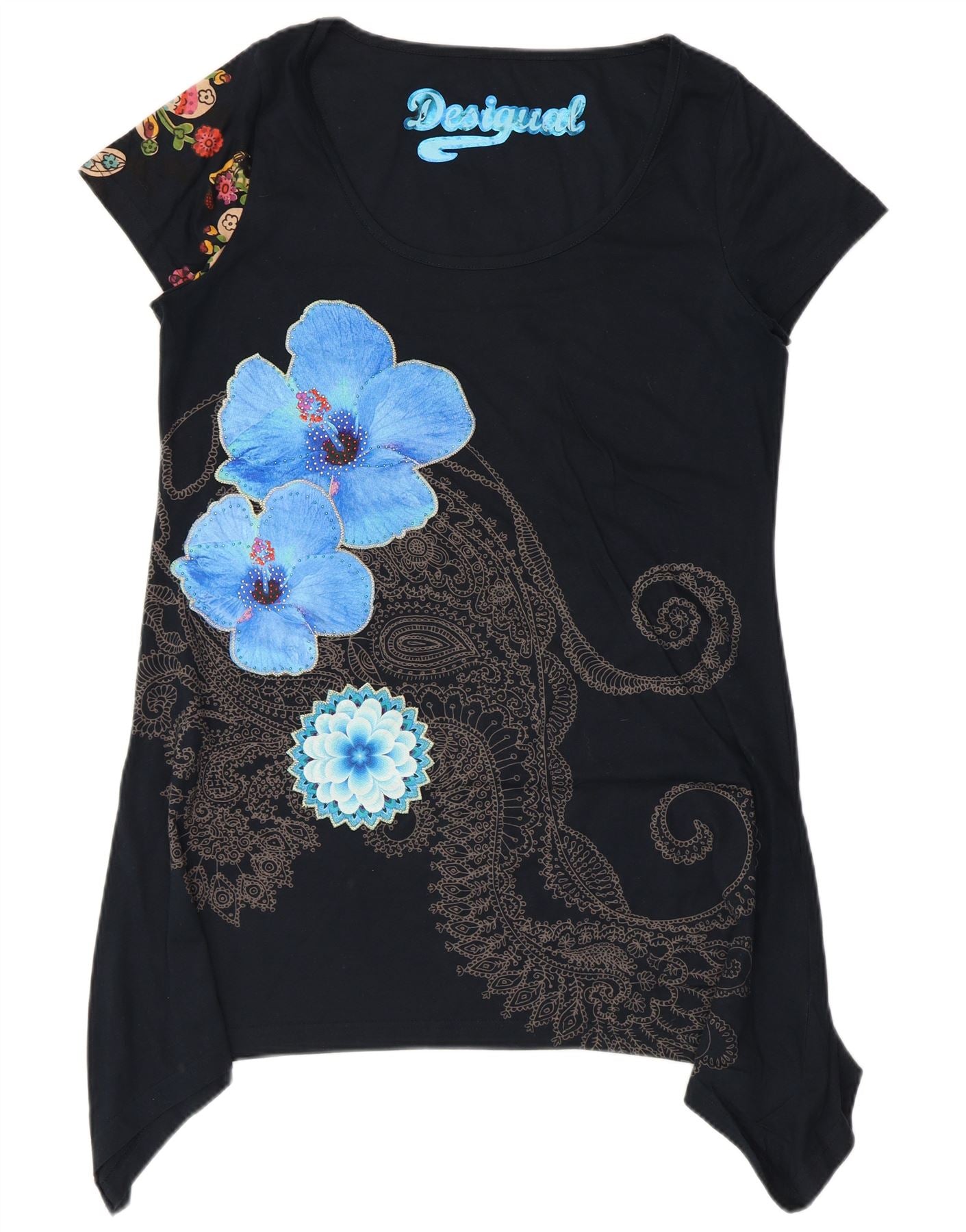 - Descrição da IA: Esta camiseta gráfica feminina da Desigual é confeccionada em tecido jersey preto macio. Possui gola redonda clássica e mangas curtas. O ajuste regular oferece um uso confortável. Um vibrante padrão floral e abstrato adorna a frente, realçado com detalhes em lantejoulas. Um ombro também exibe uma estampa floral colorida. O design incorpora um estilo boêmio distinto, perfeito para um visual casual único.