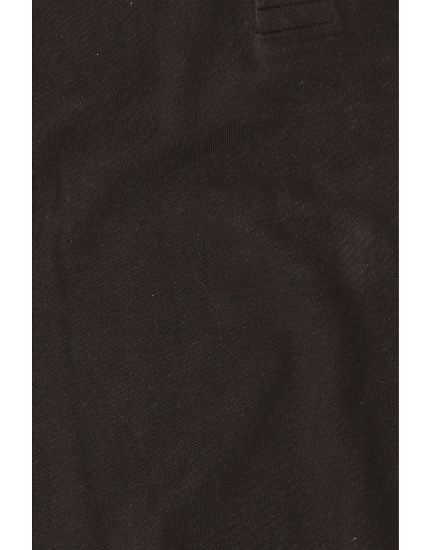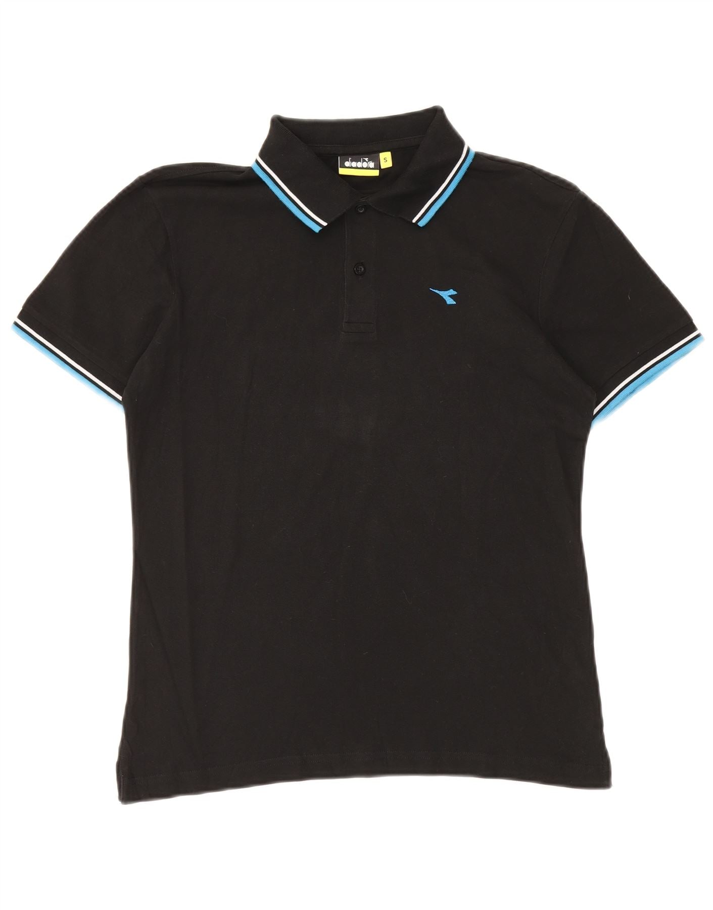 - Descrição da IA: Esta camisa polo masculina Diadora é confeccionada em jersey preto macio 100% algodão. Possui decote clássico com gola e carcela de três botões. As mangas curtas são finalizadas com punhos canelados. A gola e os punhos exibem detalhes distintos de listras azuis e brancas. Um logotipo bordado sutil adorna o peito. Este polo de ajuste regular oferece conforto e um estilo casual elegante.