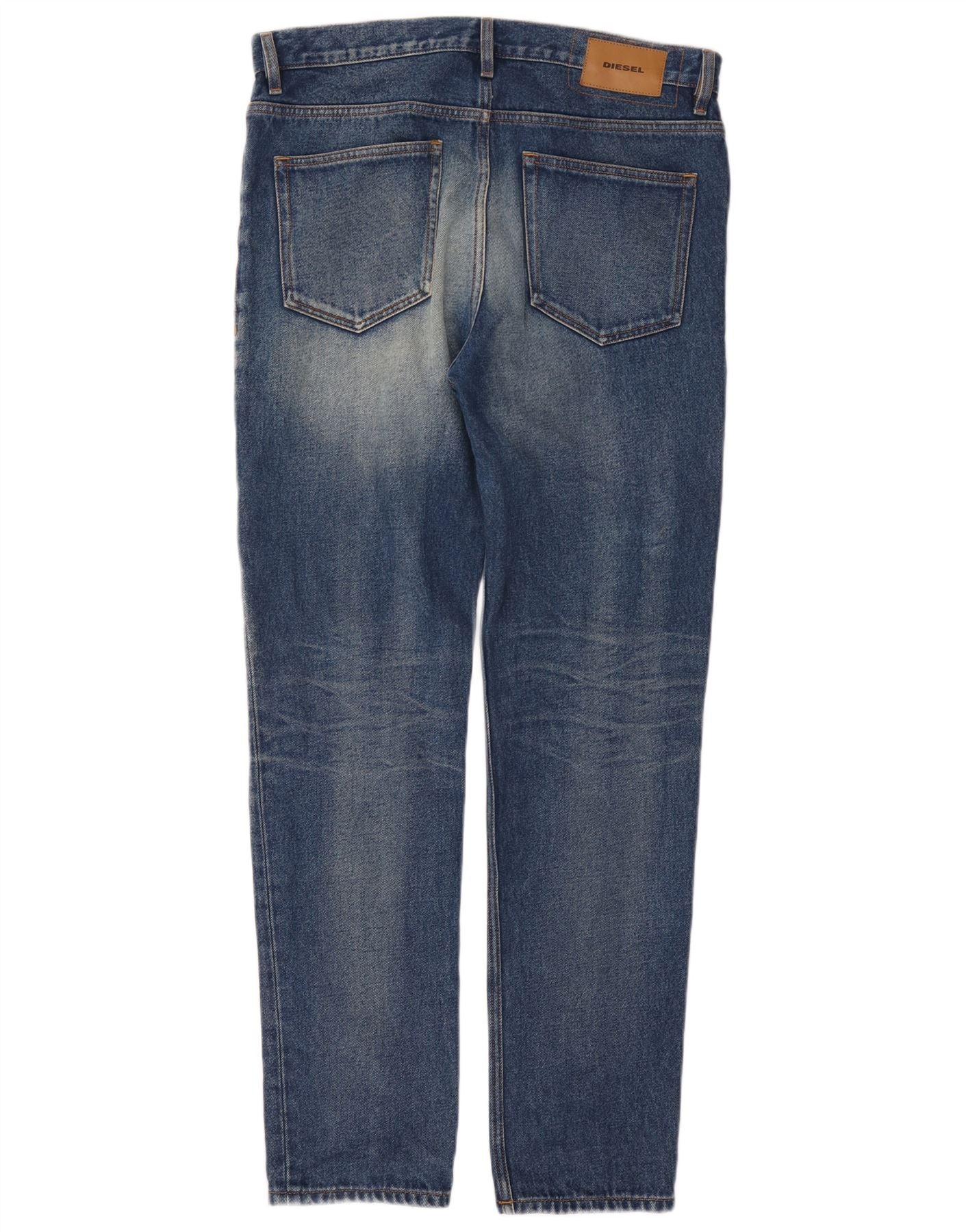 - Descrição da IA: Este jeans cônico masculino Diesel é confeccionado em jeans 100% algodão em uma clássica lavagem azul. O tecido apresenta uma textura sutil desbotada, adicionando personalidade. O fecho de botão e o ajuste regular garantem conforto e uma silhueta atemporal. As pernas cônicas estreitam-se suavemente em direção ao tornozelo para um visual moderno. Bolsos práticos e um logotipo da marca completam o design.