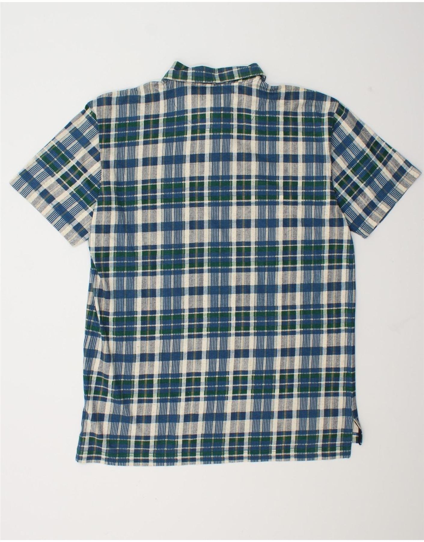 - Descrição da IA: Esta camiseta masculina Dockers é confeccionada em uma mistura respirável de algodão e linho. Possui decote clássico com gola e fechamento por botão. O padrão xadrez azul, verde e branco oferece um visual atemporal. Mangas curtas e corte regular garantem conforto e facilidade de movimento. Este top versátil é perfeito para uso casual.