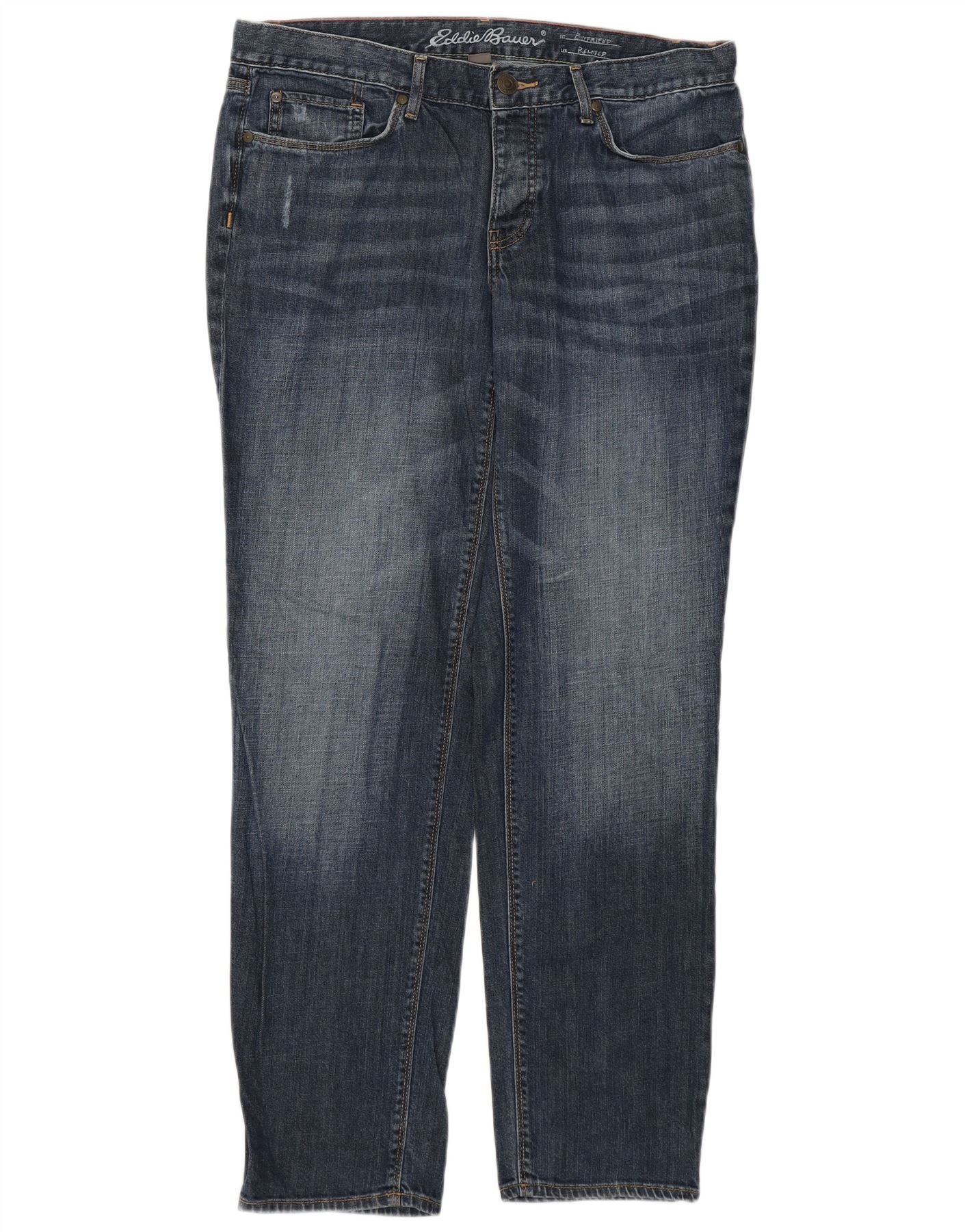 - Descrição da IA: Estes jeans clássicos femininos Eddie Bauer são confeccionados em jeans azul com corte regular. O fecho de botão e o ajuste regular criam uma silhueta atemporal. Esses jeans estilo boyfriend apresentam bolsos práticos. O jeans proporciona estrutura e durabilidade. Um básico versátil para uso casual.