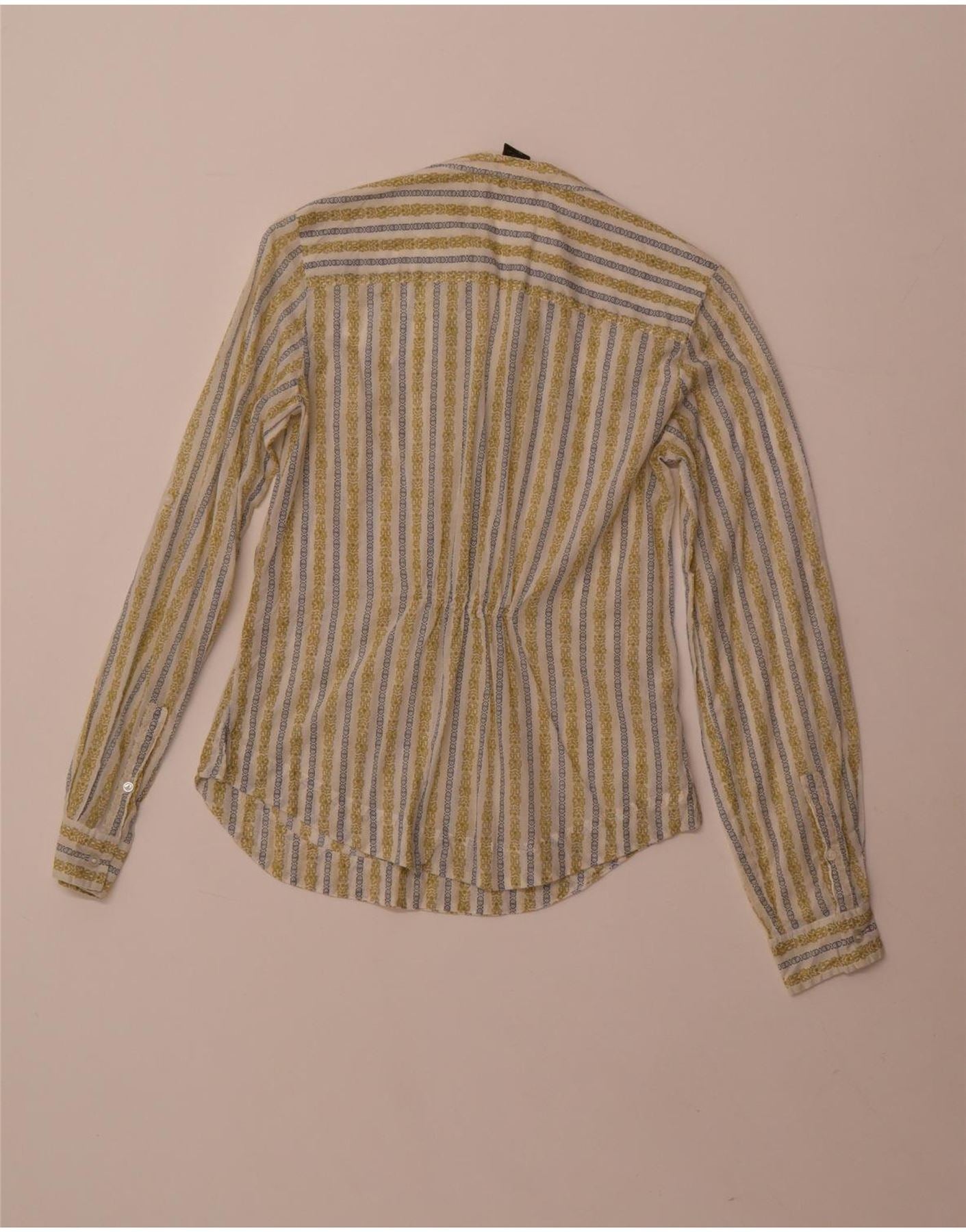 - Descrição da IA: Esta blusa feminina Eddie Bauer é confeccionada em tecido 100% algodão, oferecendo uma sensação leve. Apresenta estampa listrada multicolorida, combinando tons off white, amarelo e azul. O decote com gola leva a um fecho frontal com botões. As mangas compridas terminam com punhos abotoados. Seu ajuste regular garante um uso confortável. O design listrado abstrato adiciona interesse visual.