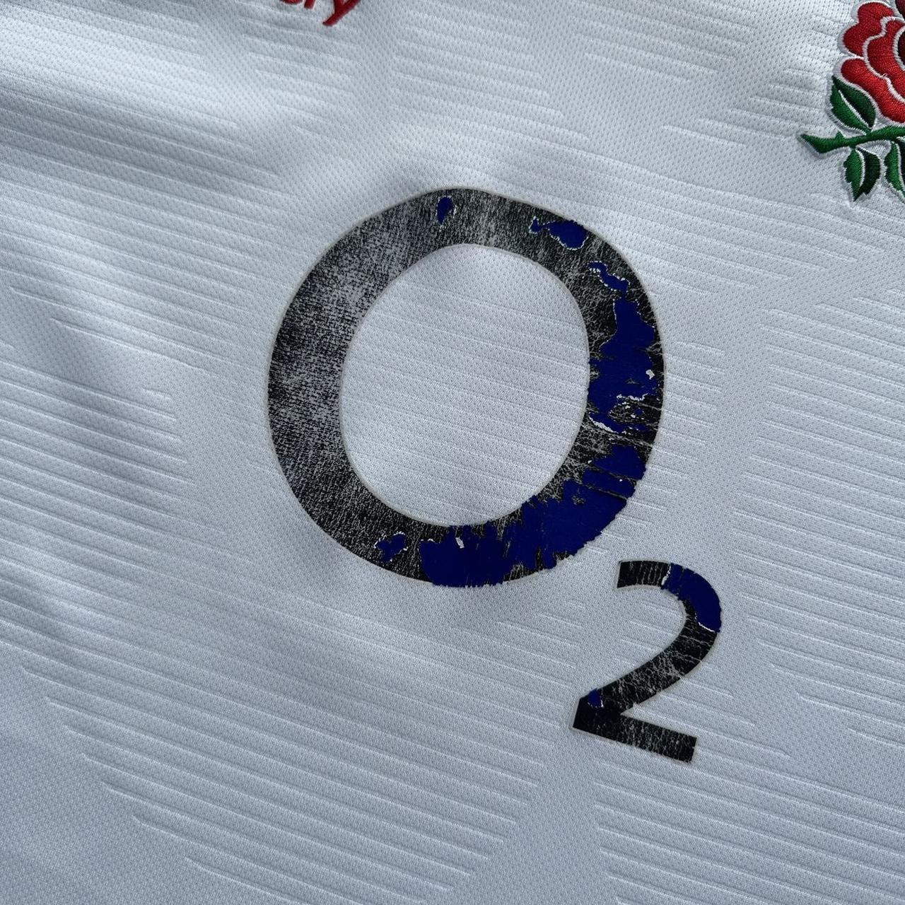 Top clássico de rugby Canterbury England em branco com logotipos bordados e patrocinador O2 no peito