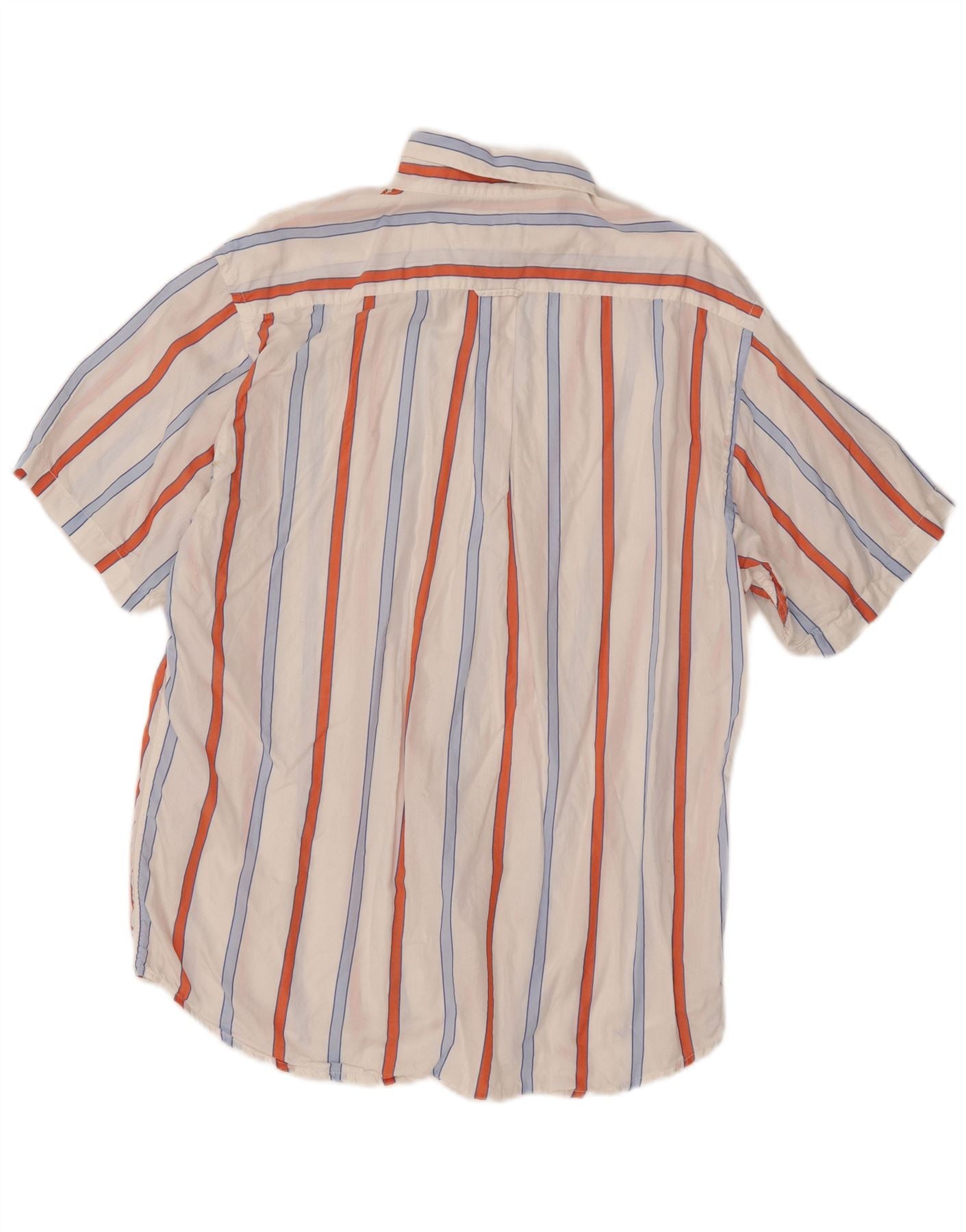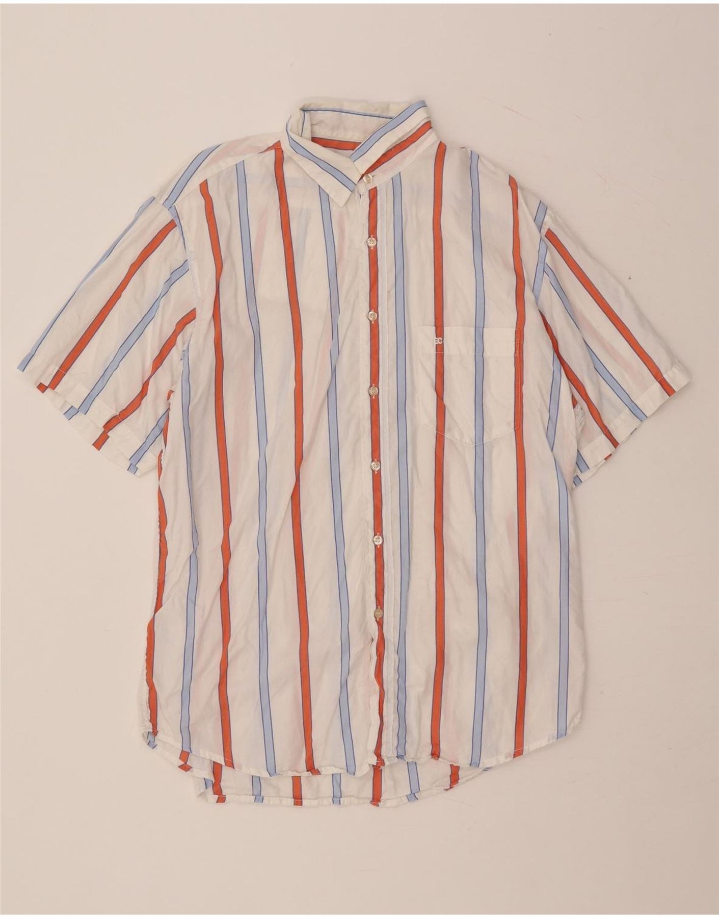 - Descrição da IA: Esta camisa masculina Enrico Coveri é confeccionada em tecido leve. Ele apresenta um padrão listrado multicolorido nítido em branco, vermelho e azul. O decote com gola e botões na frente oferecem um visual clássico. Mangas curtas e corte regular garantem conforto e facilidade de uso. Um único bolso no peito acrescenta detalhes práticos. Esta peça versátil é perfeita para ocasiões casuais elegantes.