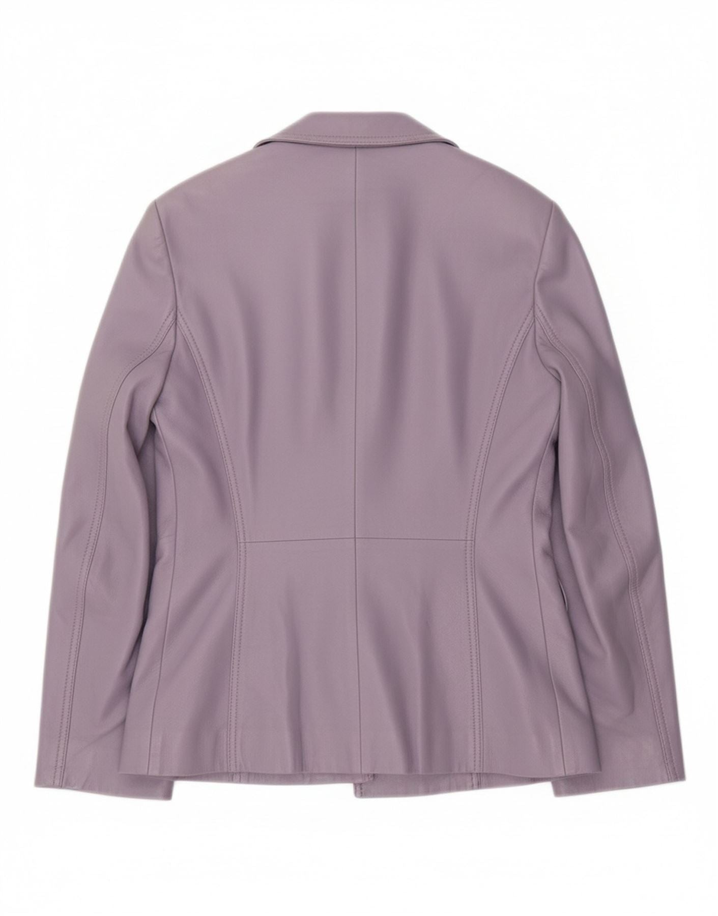 - Descrição da IA: Esta jaqueta Blazer feminina Escada é confeccionada em couro lilás luxuoso com acabamento liso. Possui decote com gola sofisticada e fecho frontal com botão único, apresentando um visual clássico de alfaiataria. Mangas compridas completam a silhueta refinada. Bolsos sutis acrescentam funcionalidade prática, enquanto o interior totalmente forrado garante conforto. O corte regular oferece um apelo atemporal e elegante, perfeito para um estilo versátil.