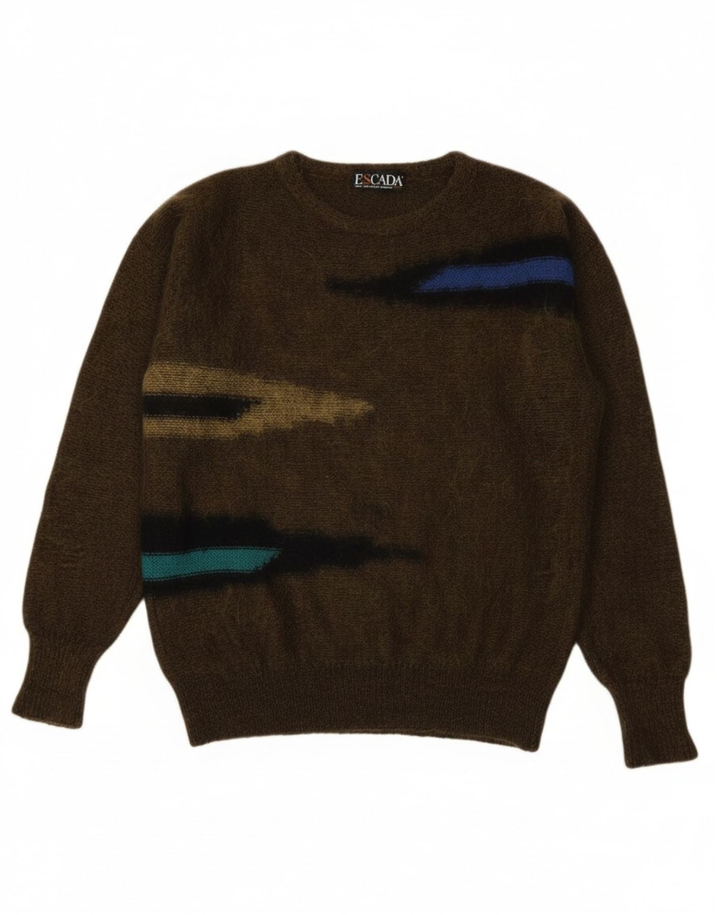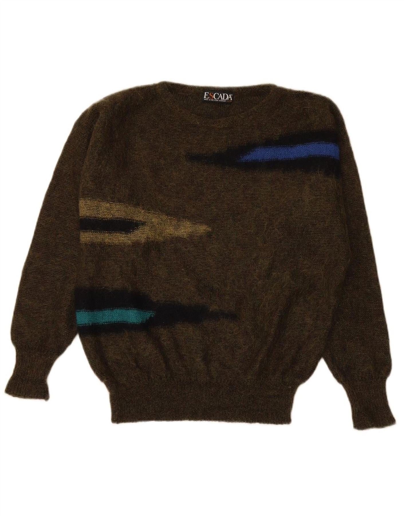 - Descrição da IA: Este suéter feminino Escada com gola redonda é confeccionado em uma luxuosa malha de mistura de mohair. O tecido macio e texturizado oferece um ajuste descontraído, perfeito para uso confortável. Possui decote redondo clássico e mangas compridas. Um impressionante padrão listrado em cáqui e tons suaves confere um apelo retrô distinto. Este design de pulôver combina calor com estilo sofisticado.