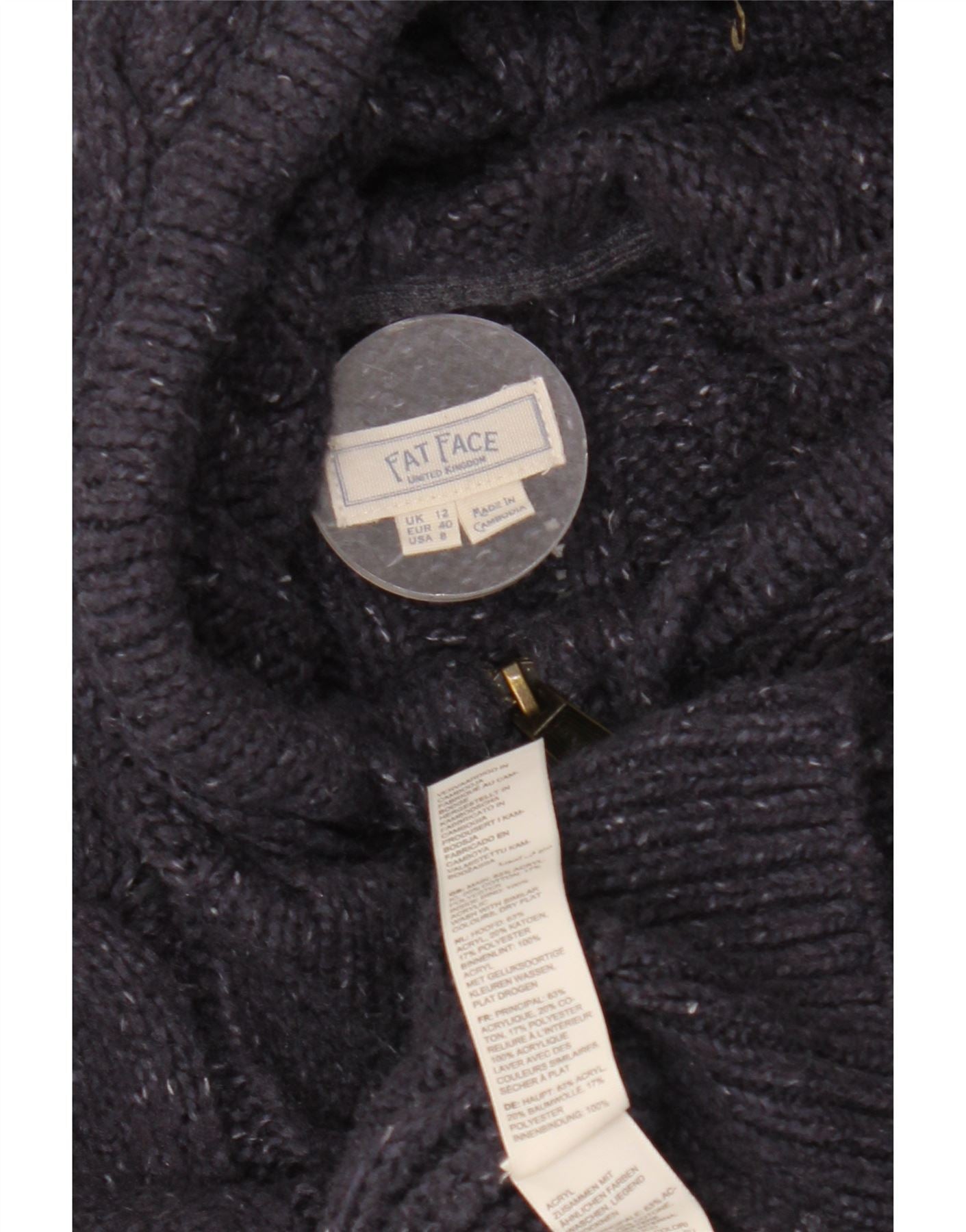 Suéter cardigã feminino com capuz Fat Face Reino Unido 12 médio azul marinho salpicado