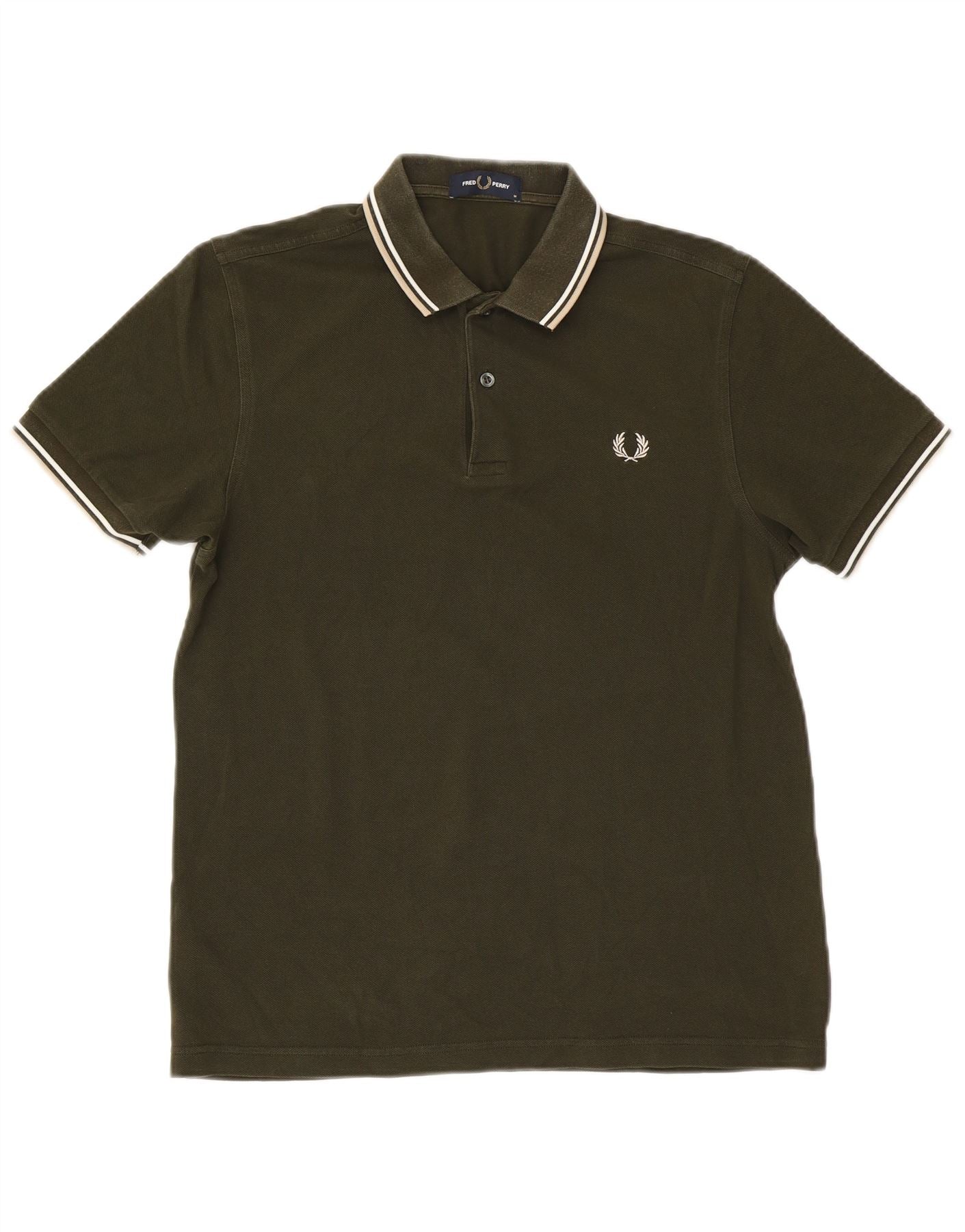 - Descrição da IA: Esta camisa pólo masculina Fred Perry é confeccionada em tecido macio de malha de algodão cáqui. Possui decote clássico com gola e carcela de três botões. A gola e os punhos das mangas curtas são detalhados com pontas duplas distintas em branco e bege. Um ajuste regular garante conforto. O icônico logotipo da coroa de louros bordado adorna o peito. Este design oferece uma estética casual elegante e atemporal.