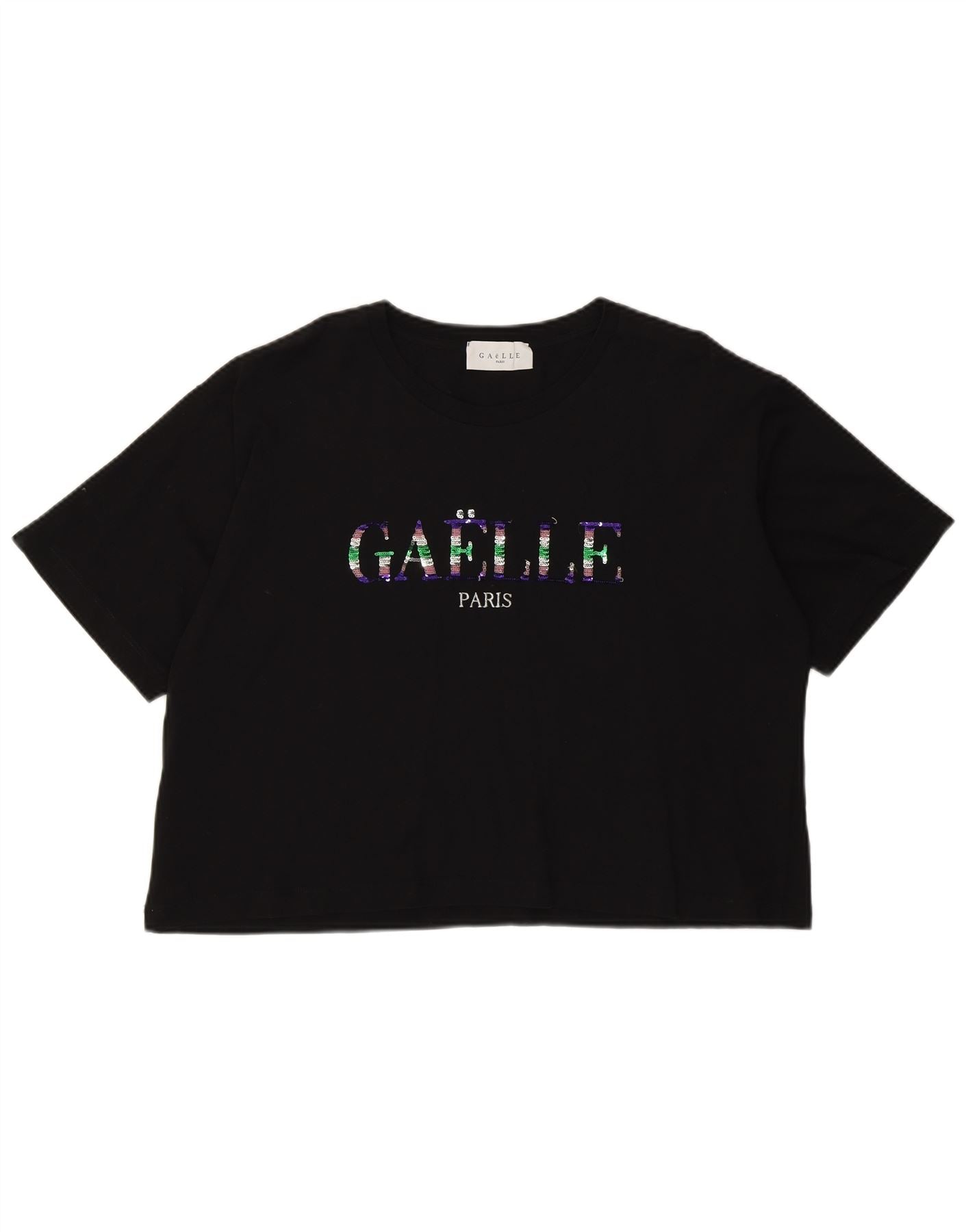 - Descrição da IA: Esta camiseta feminina com estampa Gaelle é confeccionada em tecido jersey preto macio. Possui gola redonda clássica e mangas curtas. O ajuste descontraído oferece um uso confortável. Seu comprimento cropped proporciona uma silhueta moderna. A frente apresenta um logotipo Gaelle embelezado com lantejoulas, adicionando um brilho distinto. Este pulôver combina estilo casual com um toque de glamour.