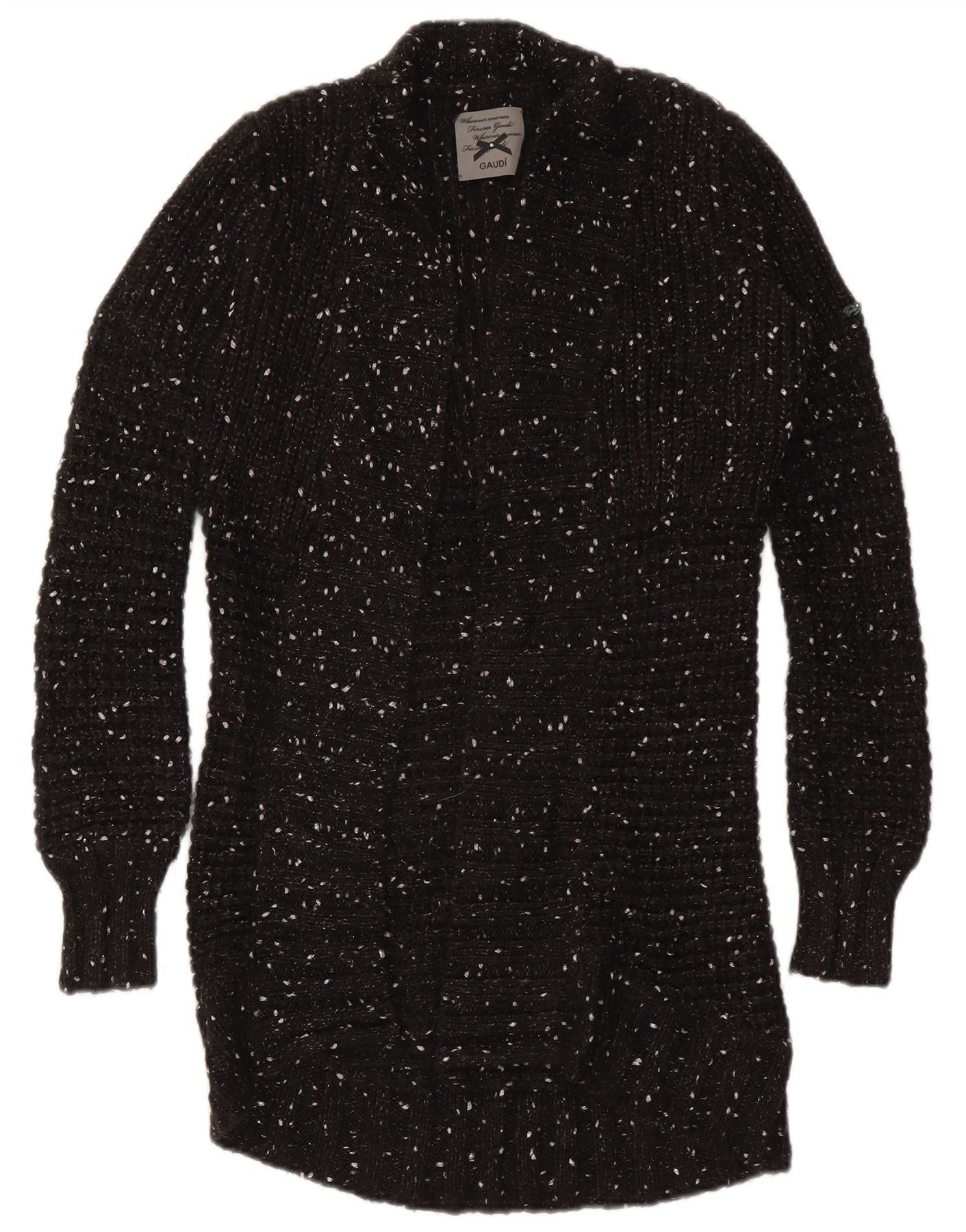 Suéter de cardigã aberto com palangre feminino Gaudi Reino Unido 10 pequeno preto manchado de nylon
