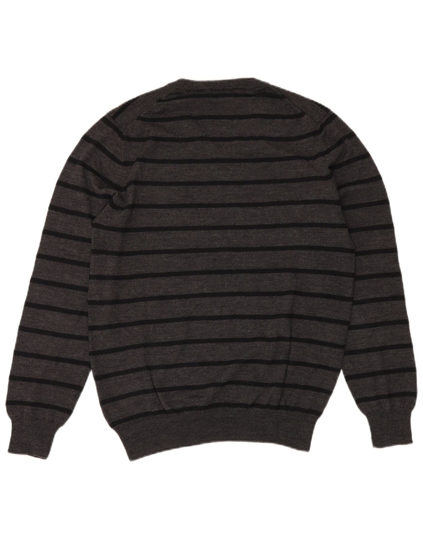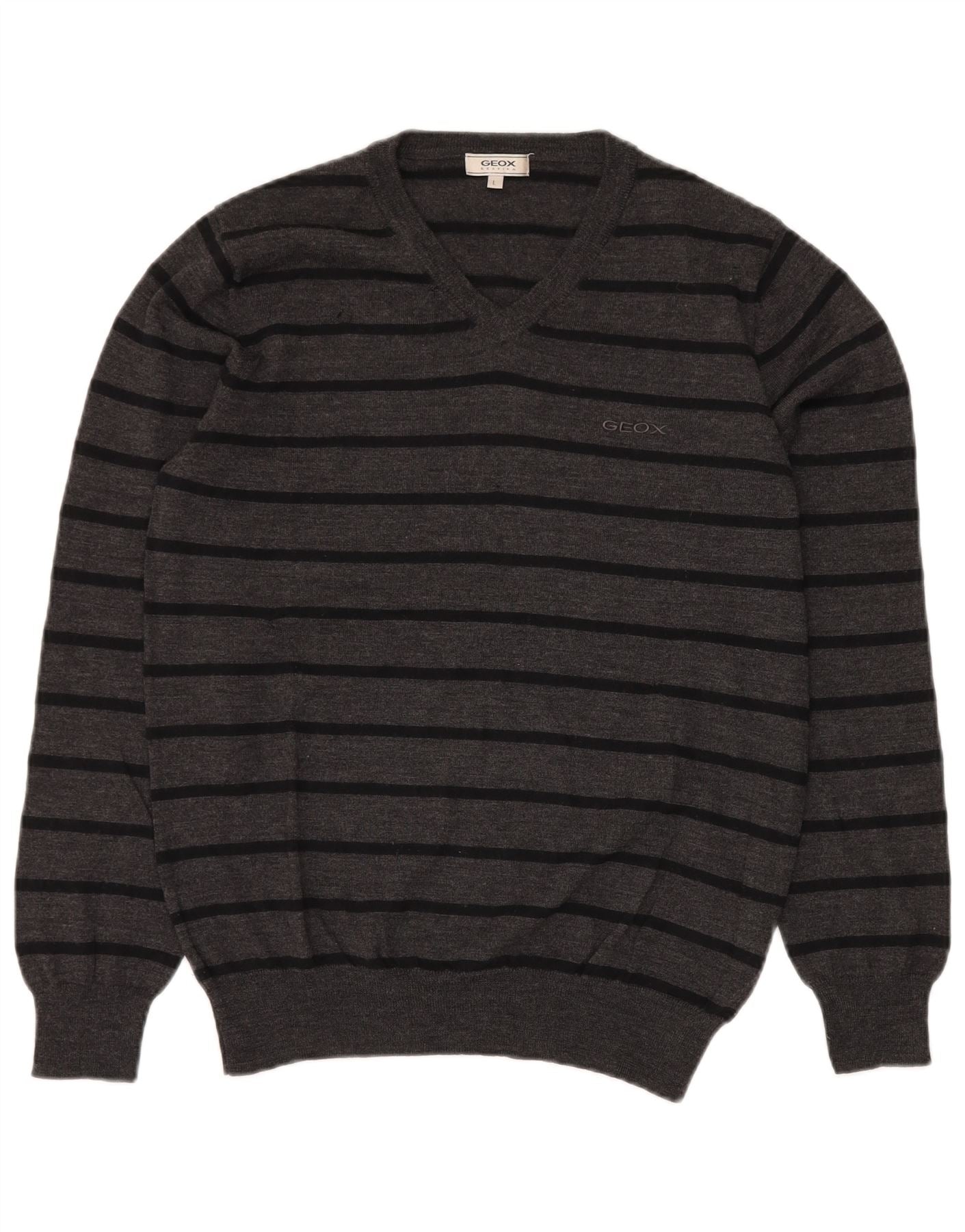 Suéter feminino GEOX com decote em V Reino Unido 16 grande lã merino listrada cinza
