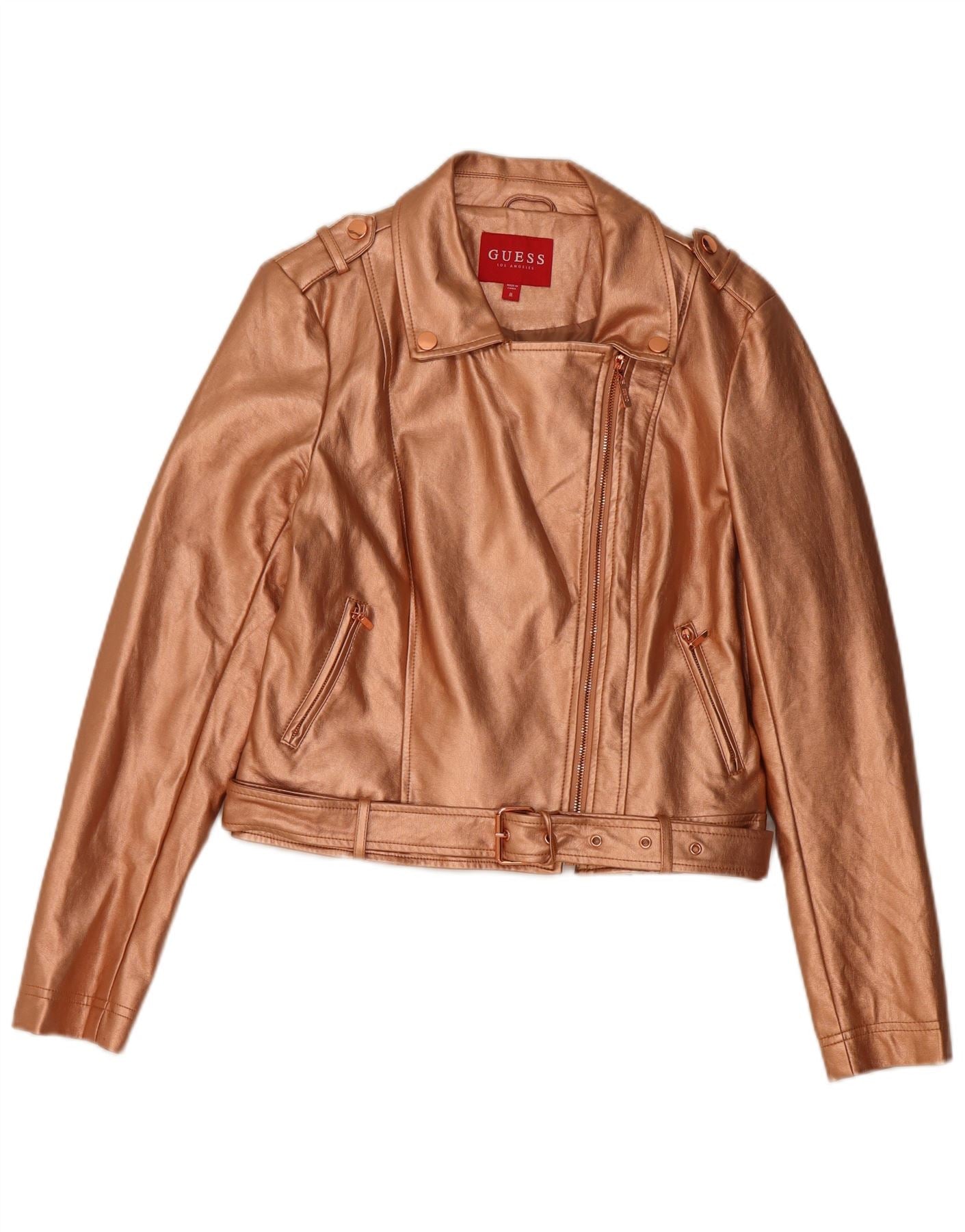 Jaqueta feminina de couro sintético GUESS para motociclista UK 12 poliuretano dourado médio