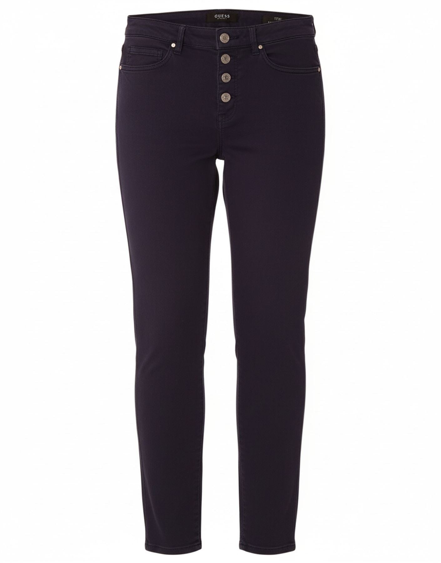 - Descrição da IA: Os jeans skinny femininos da Guess vêm em um rico azul marinho. Fabricados com uma mistura confortável de algodão, liocel e elastano, oferecem excelente elasticidade. A cintura alta esculpe uma silhueta lisonjeira. Um fecho de botão e zíper garante o ajuste. Pernas finas criam uma linha elegante e moderna. O estilo clássico de cinco bolsos oferece detalhes práticos, combinando estilo contemporâneo com excelente conforto.