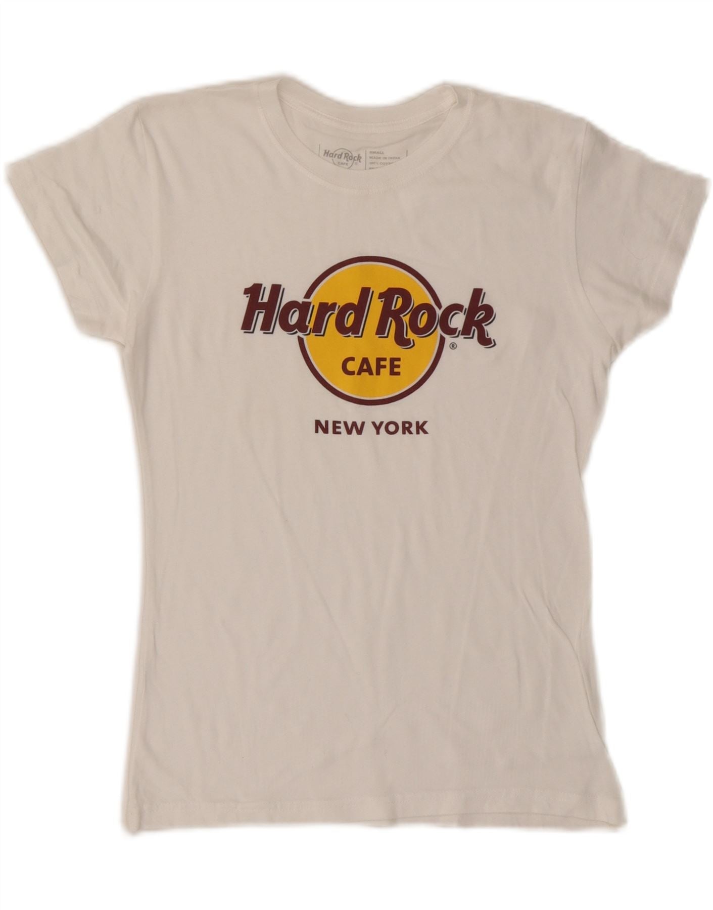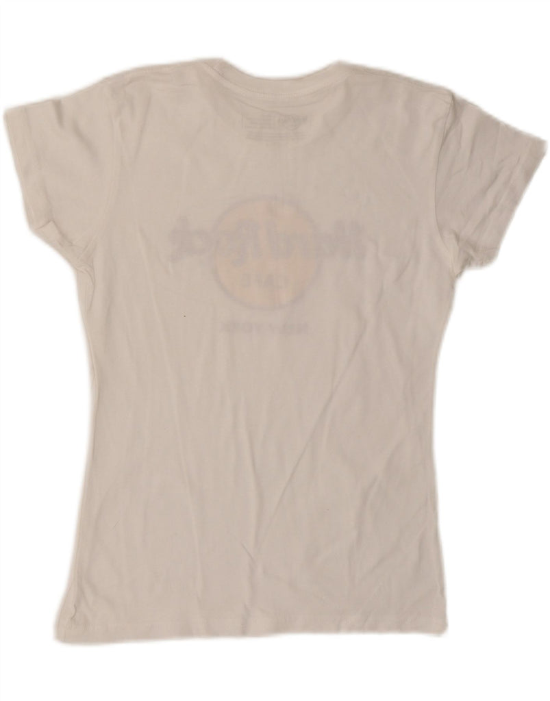 Camiseta feminina HARD ROCK CAFE New York Graphic Top UK 10 pequena branca