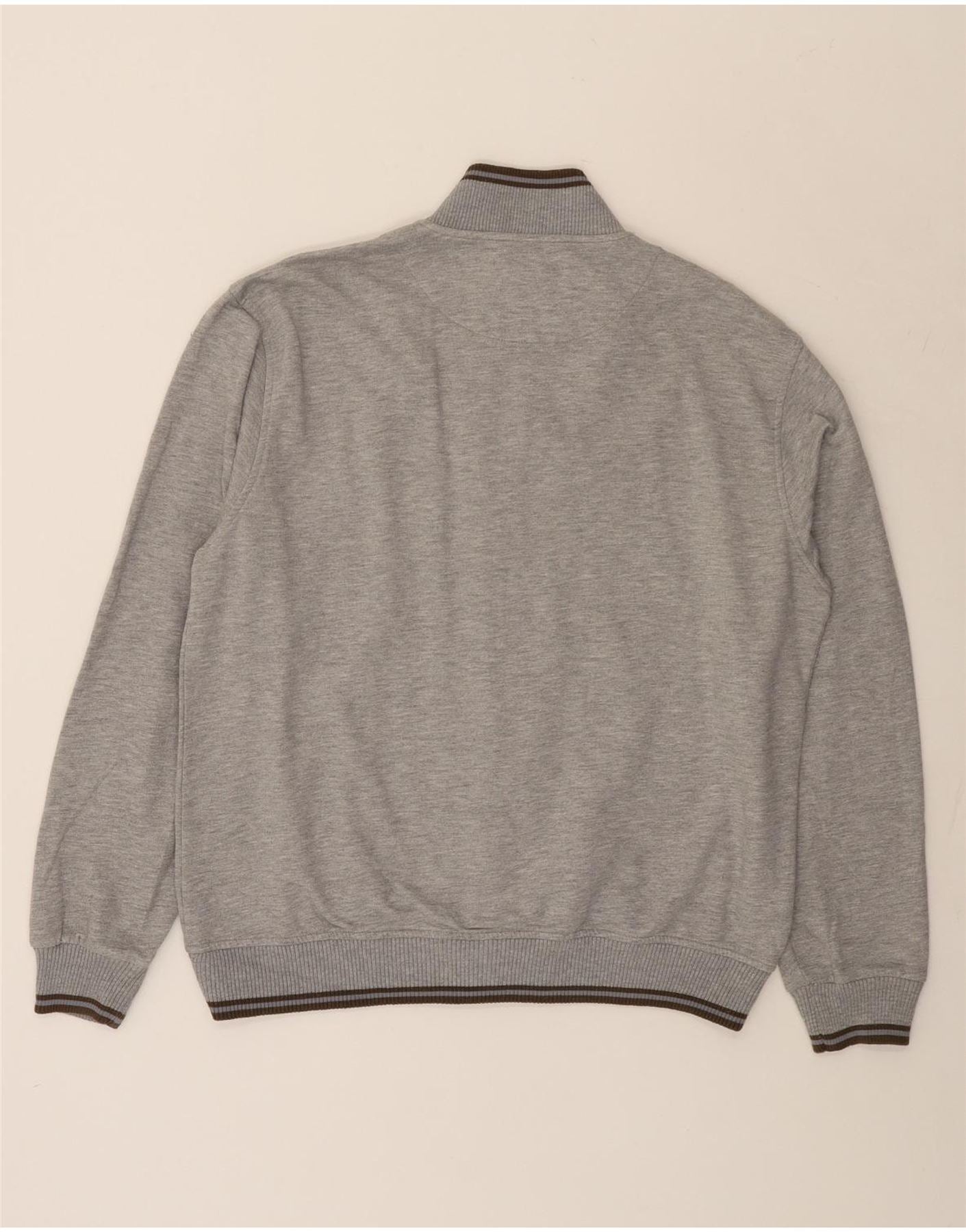 - Descrição da IA: Este moletom masculino Harmont & Blaine é confeccionado em jersey cinza macio 100% algodão. Possui gola alta e fecho de correr completo para um estilo versátil. O ajuste regular garante um uso confortável. As mangas compridas e a bainha são algemadas com detalhes listrados sutis. Um pequeno logotipo bordado acrescenta um toque refinado à marca.