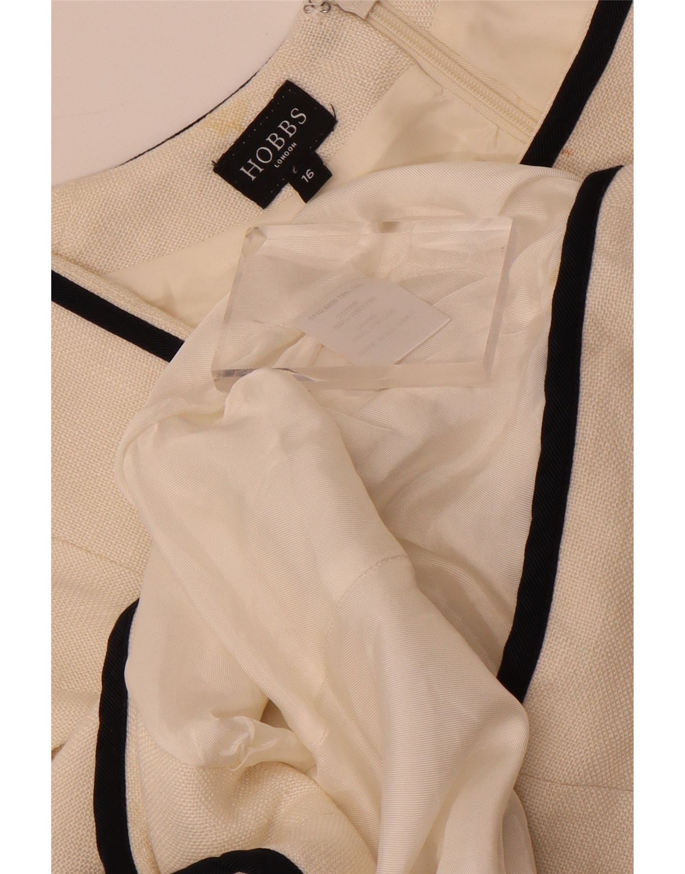 • Descrição da IA: Este conjunto feminino de 2 peças Hobbs apresenta uma jaqueta off white e vestido combinando. A jaqueta é confeccionada em mistura de poliéster com uma textura sutil. Possui decote com gola com debrum preto elegante e mangas 3/4. Um único fecho de botão preto e bolsos falsos completam seu visual clássico. O vestido que acompanha tem decote quadrado, também com acabamento preto, e mangas curtas. Ambas as peças são totalmente forradas, oferecendo um caimento regular e uma silhueta refinada e sob medida.