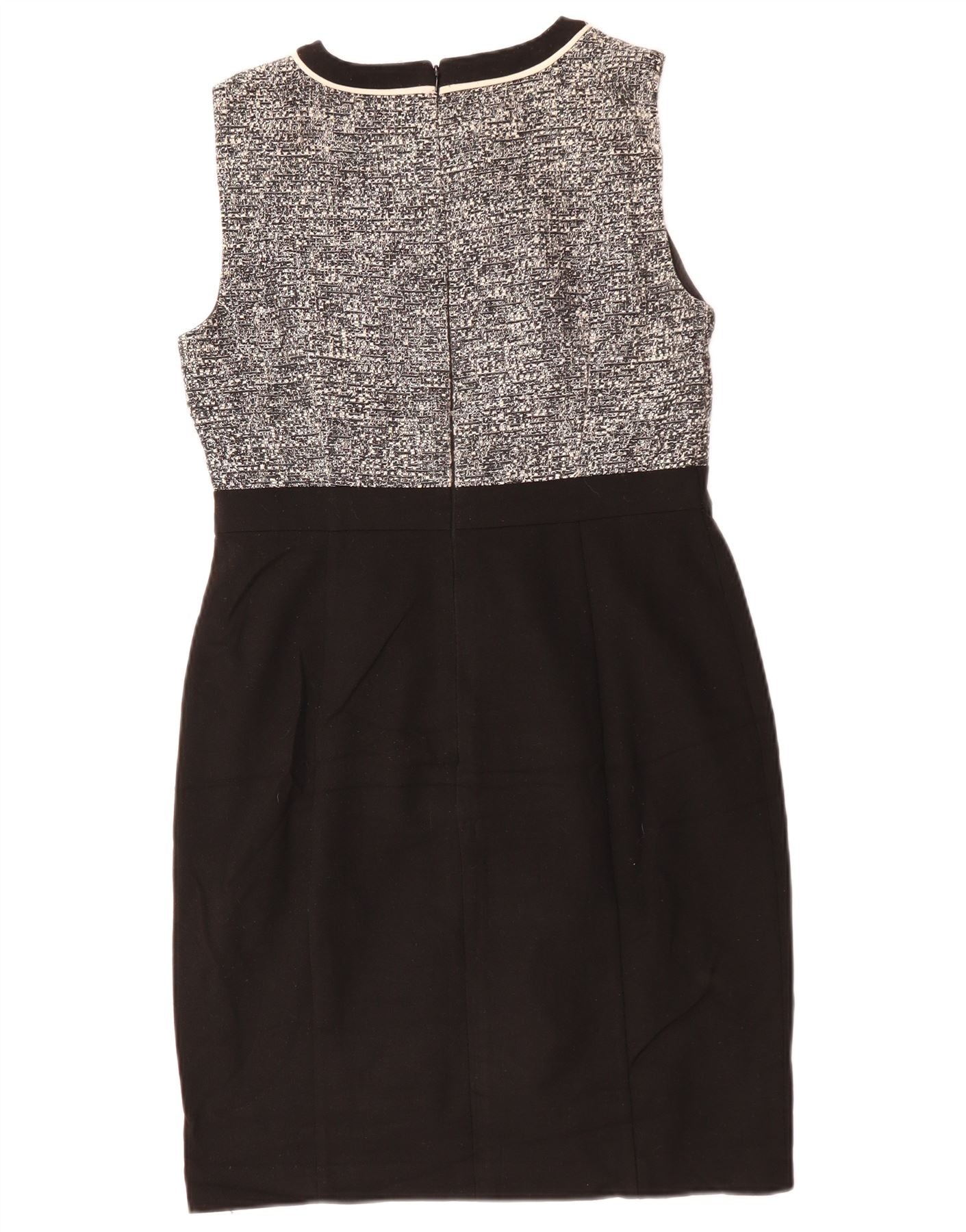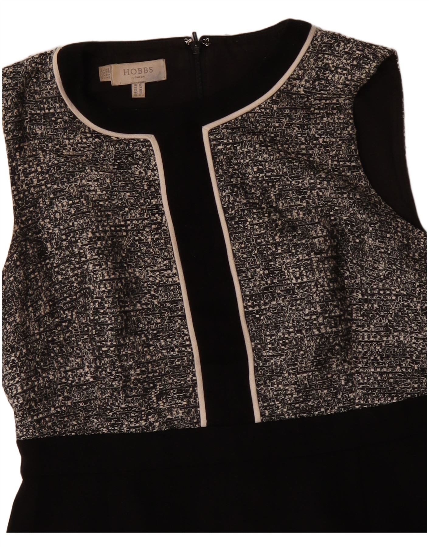 - Descrição da IA: Este vestido feminino Hobbs apresenta um sofisticado corpete de tweed salpicado de preto e branco. A saia inferior é confeccionada em tecido preto liso. Possui decote redondo clássico e corte sem mangas. Um acabamento contrastante delineia o decote e o painel central. O ajuste regular oferece uma silhueta lisonjeira. O padrão salpicado no corpete acrescenta interesse textural. Um fecho de correr traseiro garante um acabamento elegante.