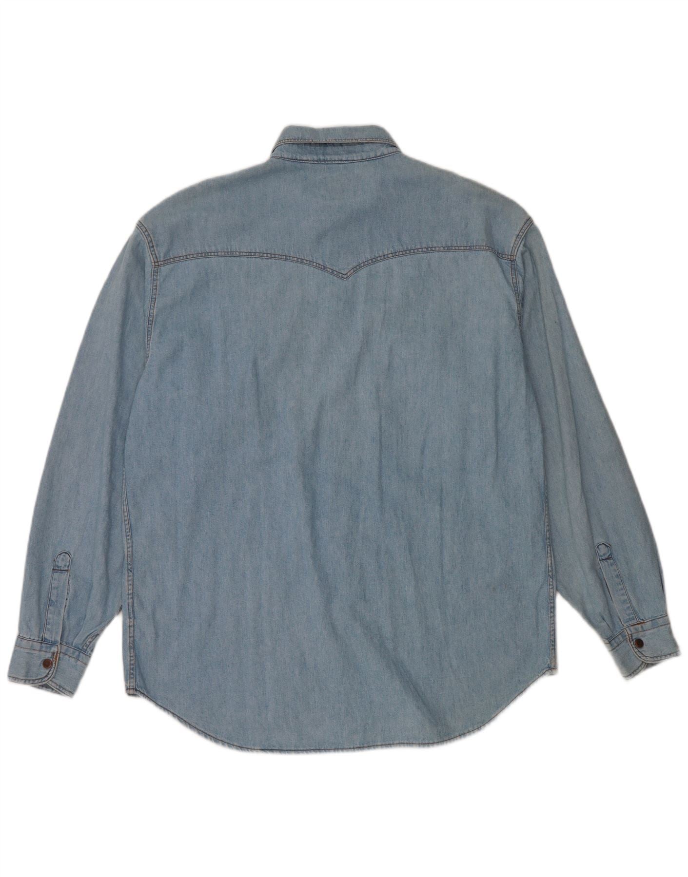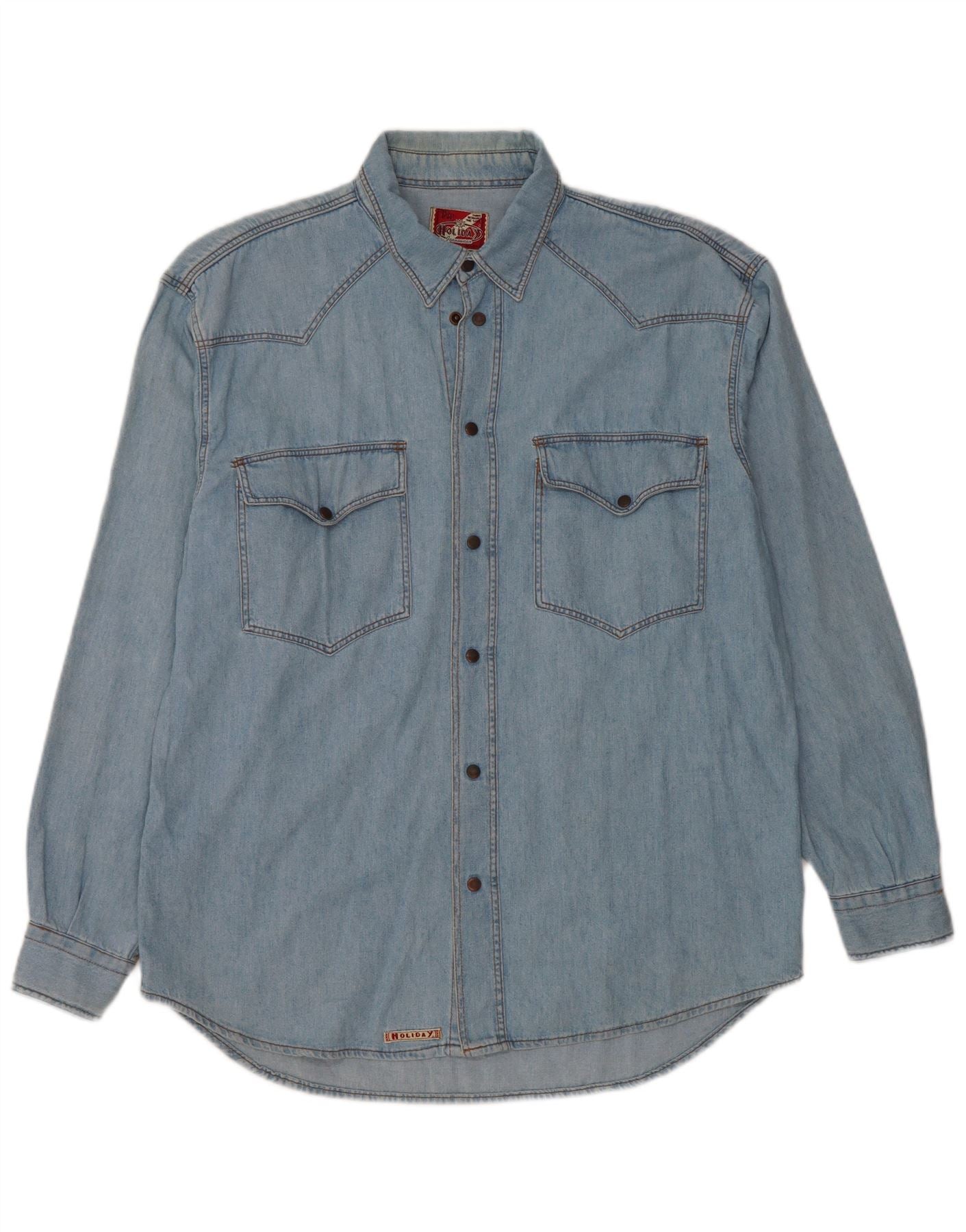 - Descrição da IA: Esta camisa jeans masculina Holiday é confeccionada em jeans 100% algodão. Possui uma lavagem azul clássica com uma textura suave. O decote com gola e as mangas compridas oferecem uma silhueta atemporal. Um fechamento completo com botões percorre a frente. Dois bolsos no peito com abas de botão acrescentam detalhes práticos. O ajuste regular garante um uso confortável. Sua alfaiataria de estilo ocidental proporciona um visual diferenciado, perfeito para camadas casuais.