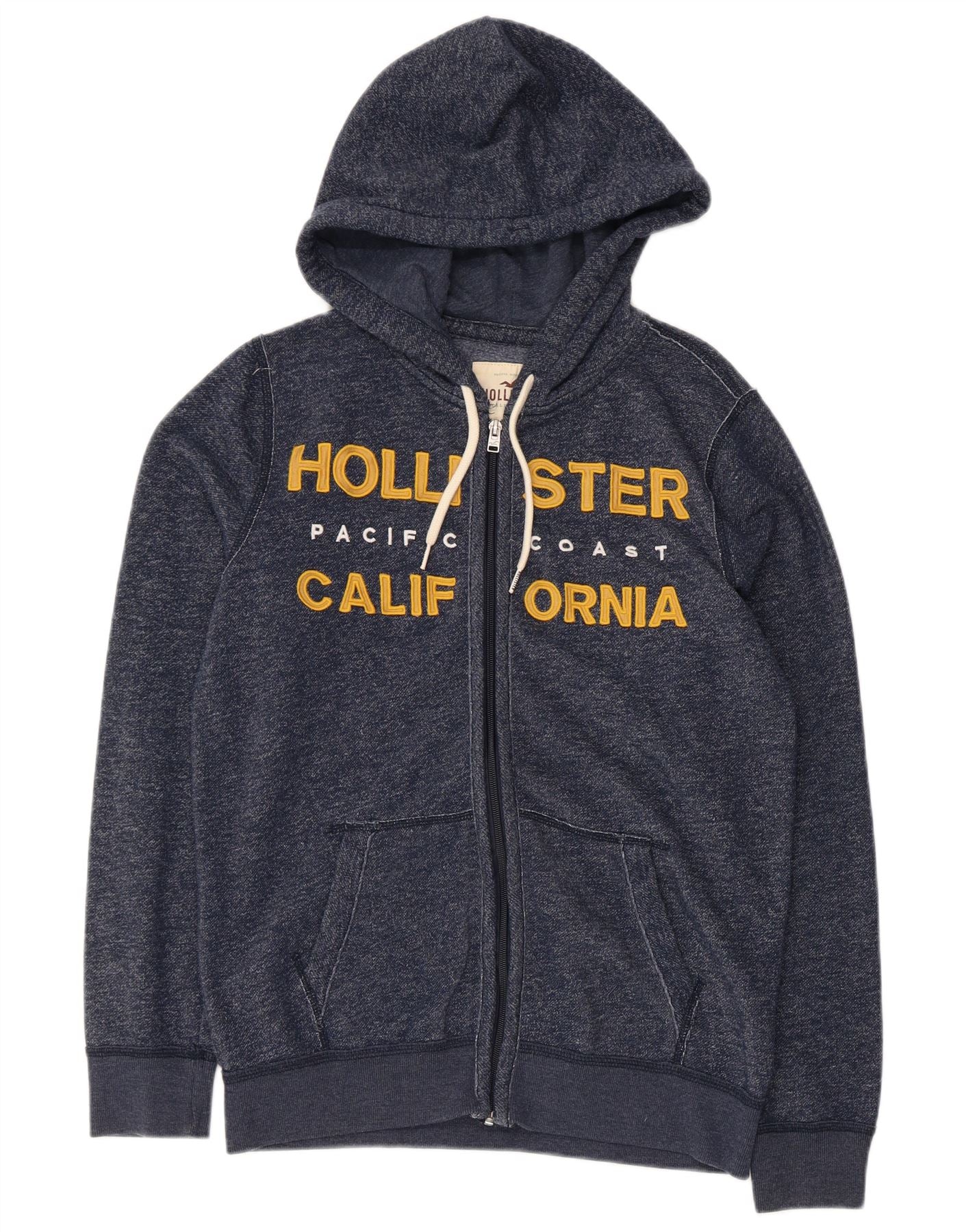 HOLLISTER Suéter masculino com capuz e zíper gráfico pequeno algodão manchado azul marinho