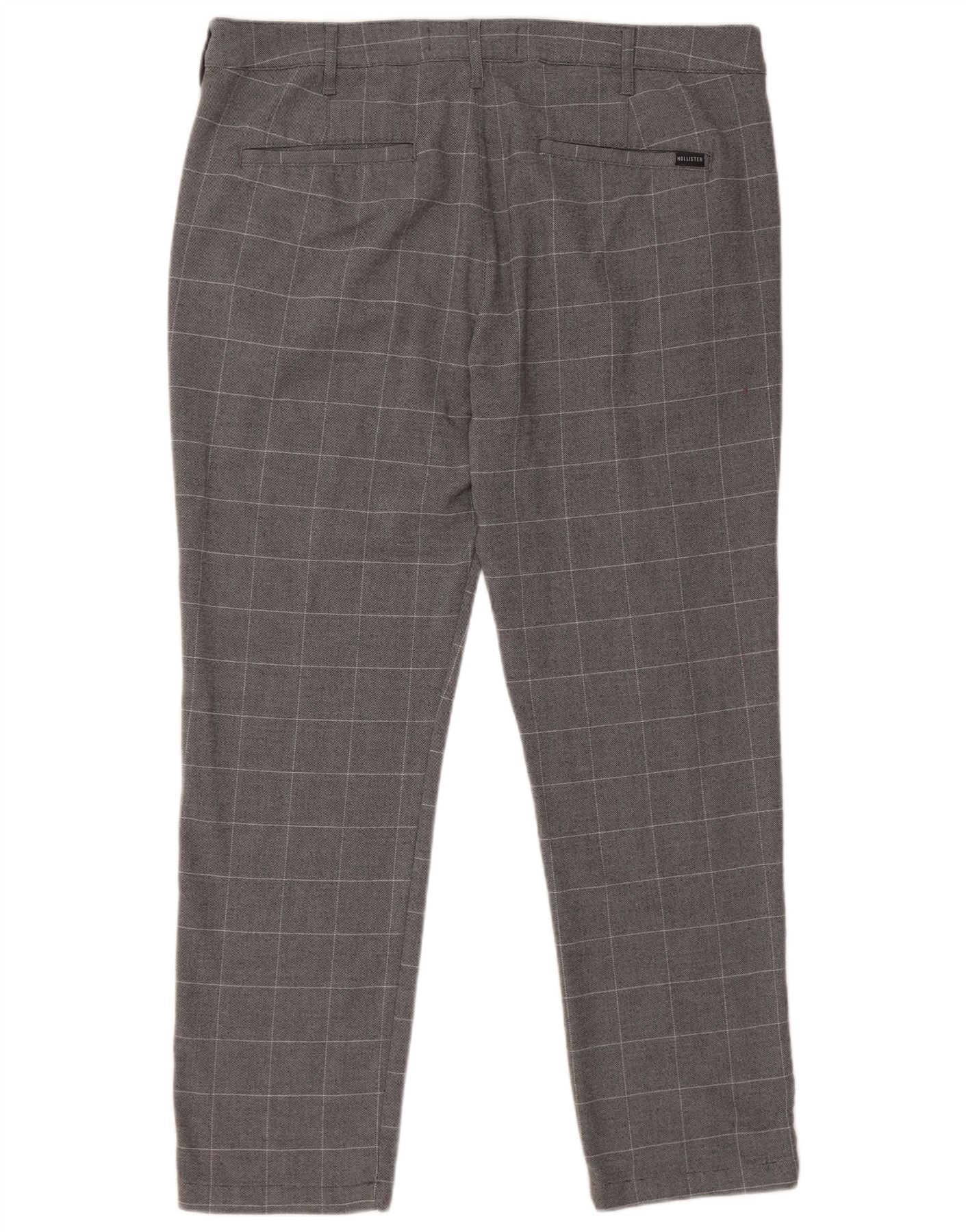 - Descrição da IA: Estas calças femininas Hollister são confeccionadas em tecido cinza mesclado com 97% poliéster e 3% elastano, oferecendo elasticidade confortável. Um padrão xadrez sutil adiciona interesse visual clássico. Eles apresentam um corte justo com fecho de correr e botões para uma frente limpa. Bolsos práticos estão incluídos. A textura tecida garante uma aparência inteligente e personalizada.