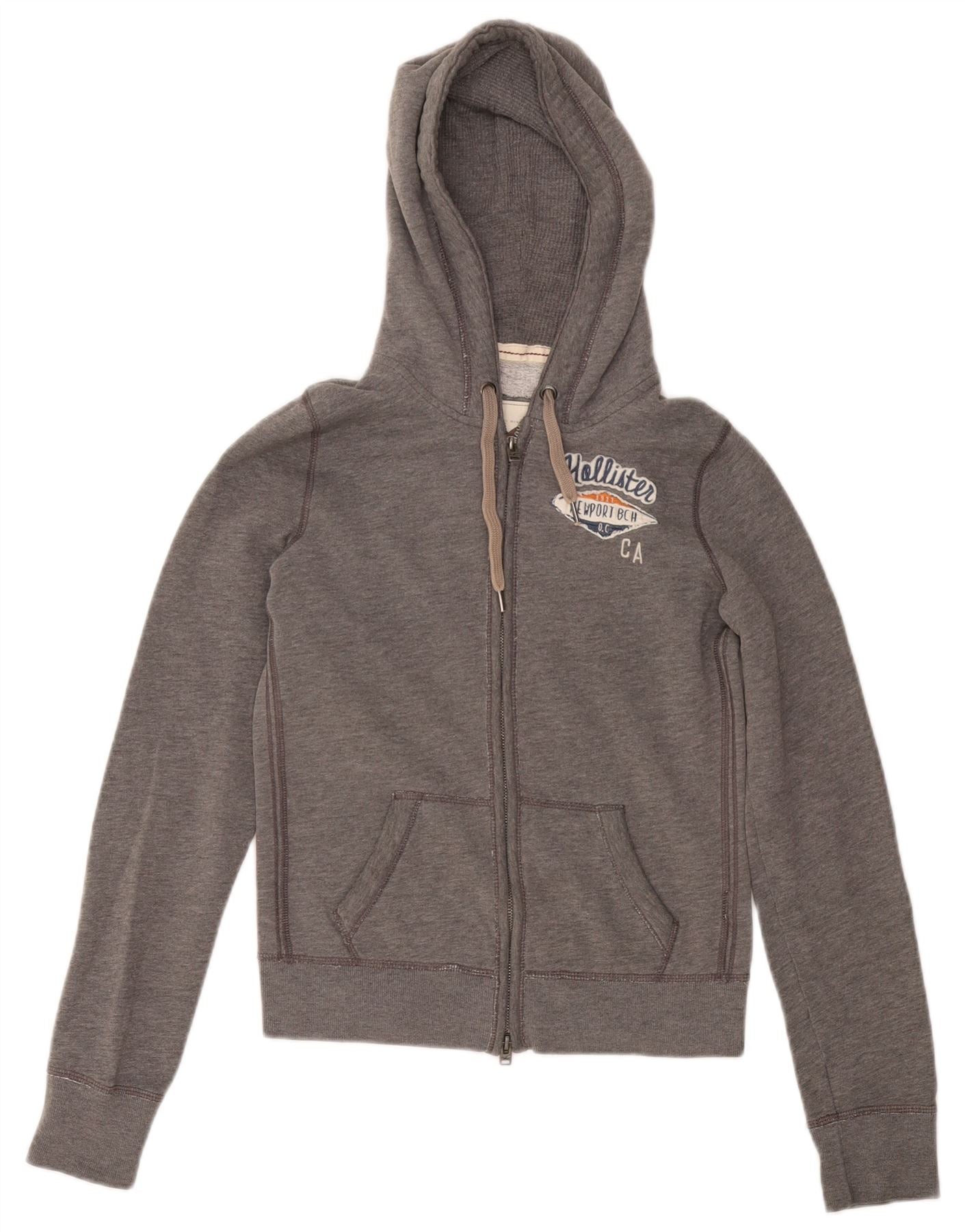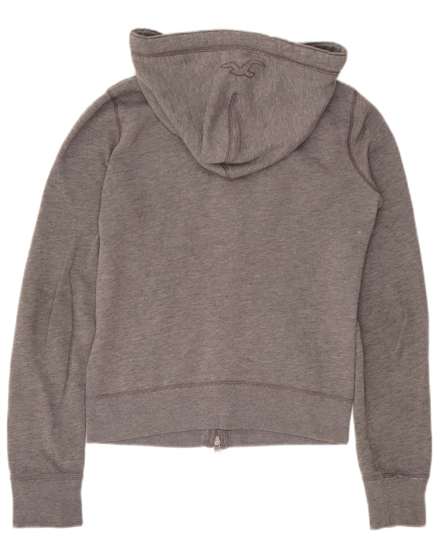Suéter feminino com capuz e zíper gráfico HOLLISTER Reino Unido 10 algodão cinza pequeno