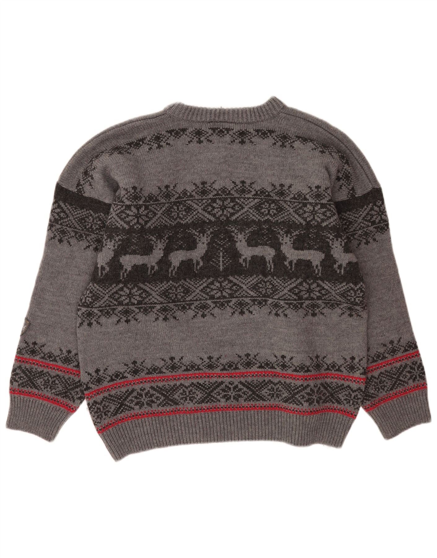 - Descrição da IA: Este suéter masculino com gola redonda da Hot Stuff é feito de malha acrílica macia para aquecimento e conforto. Possui gola redonda clássica e mangas compridas com punhos. O ajuste regular garante facilidade de uso. Um padrão distinto de Fair Isle em preto e cinza, com motivos de veados, adorna o corpo. Detalhes de listras vermelhas adicionam um toque vibrante. Este estilo pulôver é perfeito para o inverno, oferecendo estilo e aconchego.
