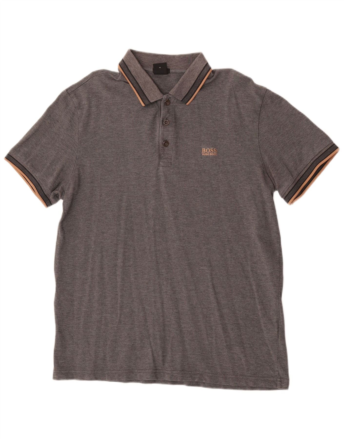 - Descrição da IA: Esta camisa pólo masculina Hugo Boss é confeccionada em malha 100% algodão cinza macio. Possui decote clássico com gola e carcela de três botões. As mangas curtas são finalizadas com punhos canelados. A gola e os punhos exibem detalhes listrados sutis em preto e laranja. Um discreto logotipo Hugo Boss é bordado no peito. O ajuste regular garante um uso confortável no dia a dia.