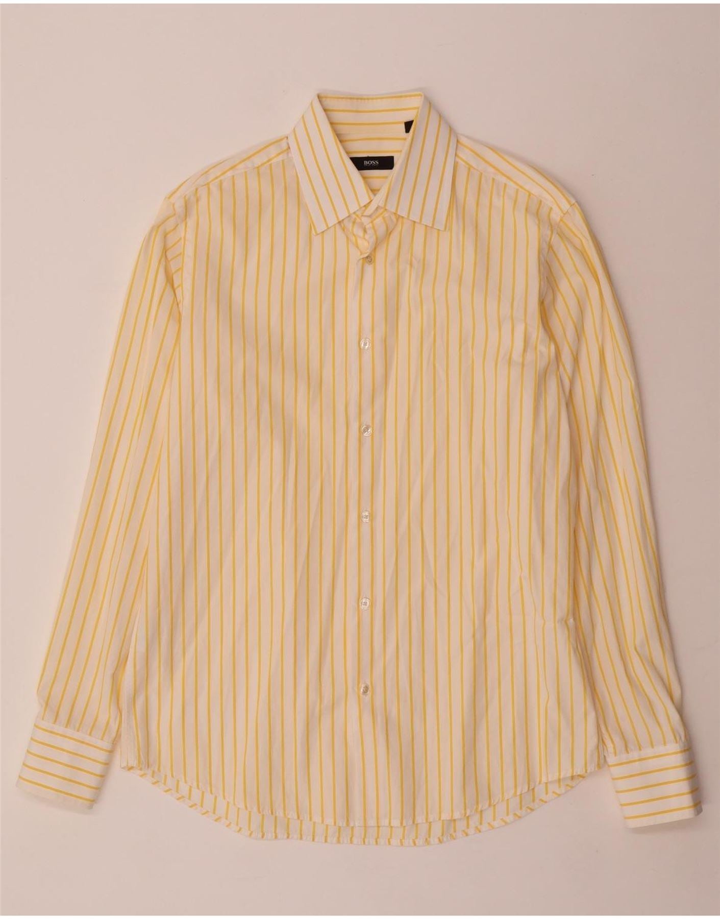 Camisa masculina HUGO BOSS tamanho 40 15 3/4 algodão listrado amarelo médio