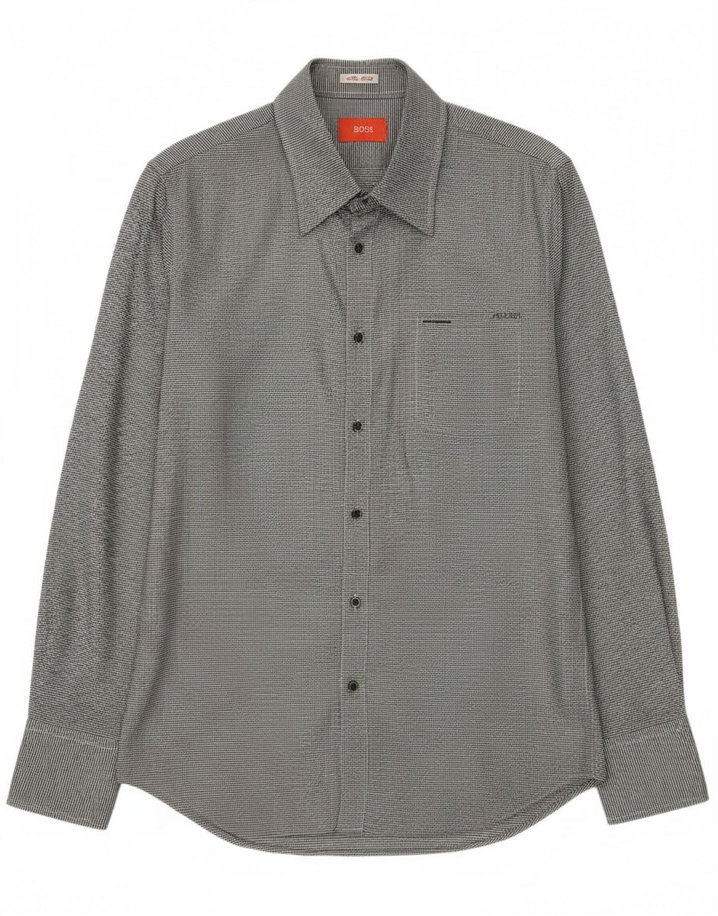 - Descrição da IA: Esta camisa masculina Hugo Boss é confeccionada em 96% algodão, apresentando uma textura finamente tecida. Ele apresenta um sofisticado padrão xadrez cinza houndstooth. O decote com gola e as mangas compridas oferecem uma silhueta clássica. A frente com botões e os punhos abotoados proporcionam detalhes refinados. Projetado com um ajuste moderno e justo, inclui um único bolso no peito. Esta camisa combina alfaiataria elegante com estilo atemporal.