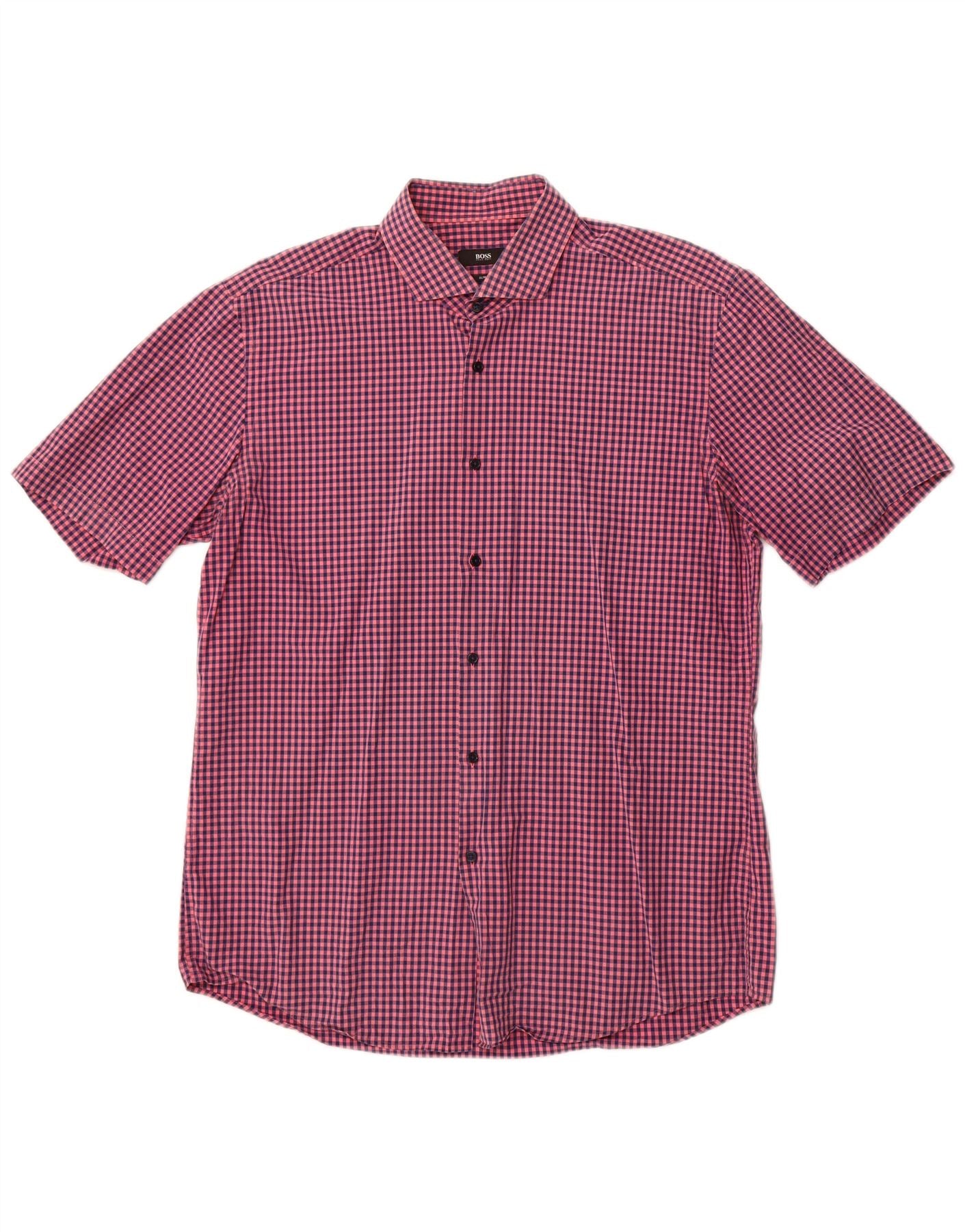 Camisa masculina de manga curta Slim Fit Hugo Boss grande guingão rosa