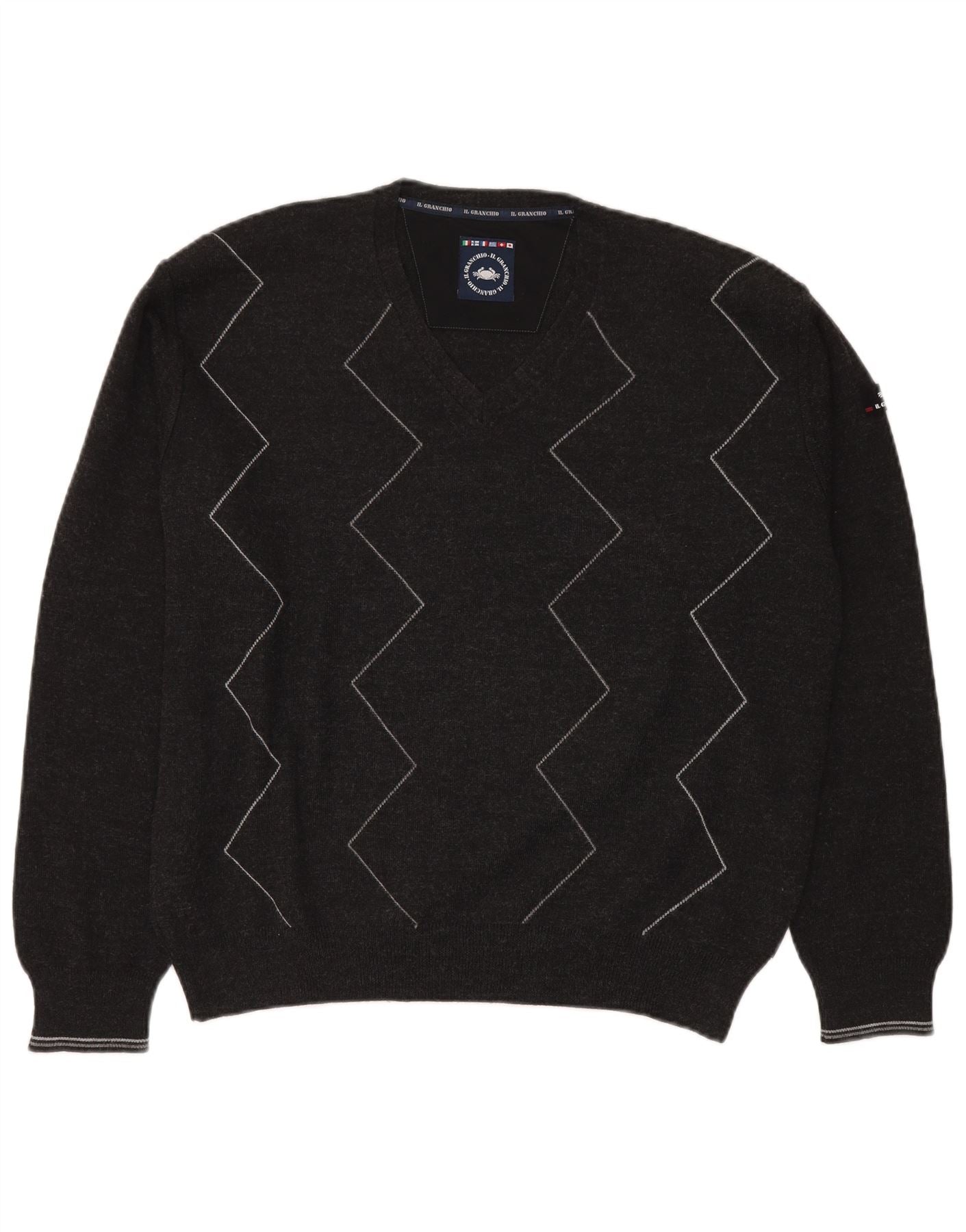 Il Granchio Suéter masculino com decote em V, grande, cinza, geométrico, nova lã