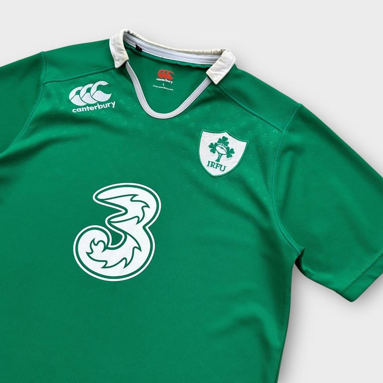 Top de rugby irlandês da Canterbury em verde com logotipos bordados e três patrocinadores no peito