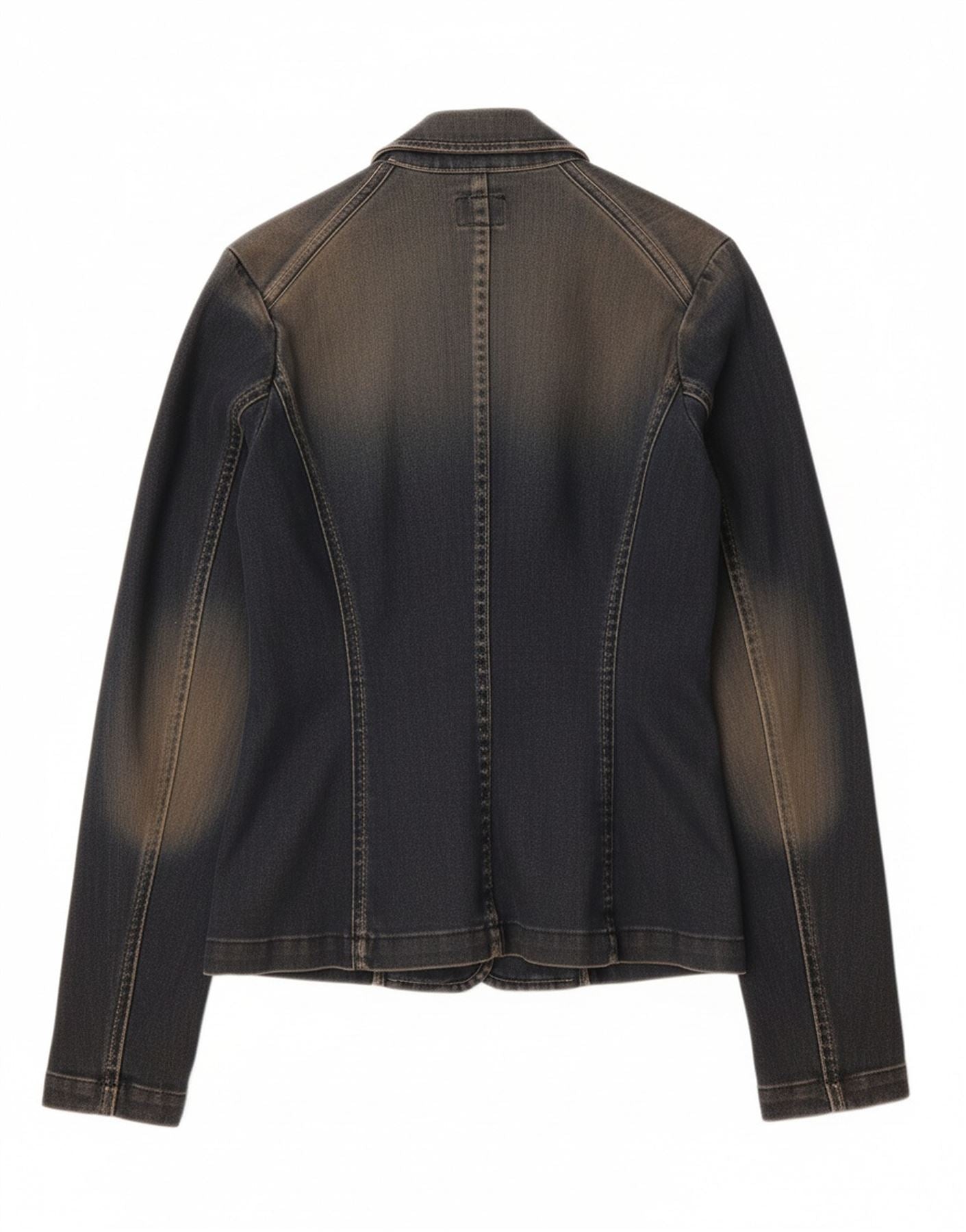 - Condição de IA: Usado | nota: Moderado | localização: Desbotamento geral em toda a jaqueta jeans, principalmente nos ombros, mangas e painéis do corpo | tipo: Descoloração