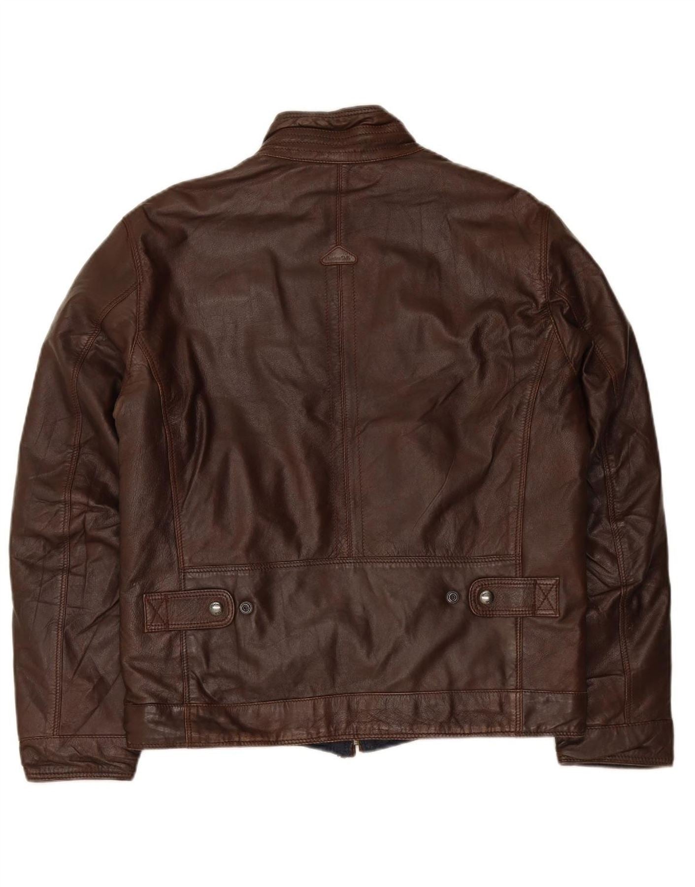 - Condição de IA: Usado | nota: Moderado | localização: Macacão no exterior de couro marrom, incluindo frente, costas e mangas, mostrando vincos e arranhões consistentes com o uso. | tipo: Desgaste visível