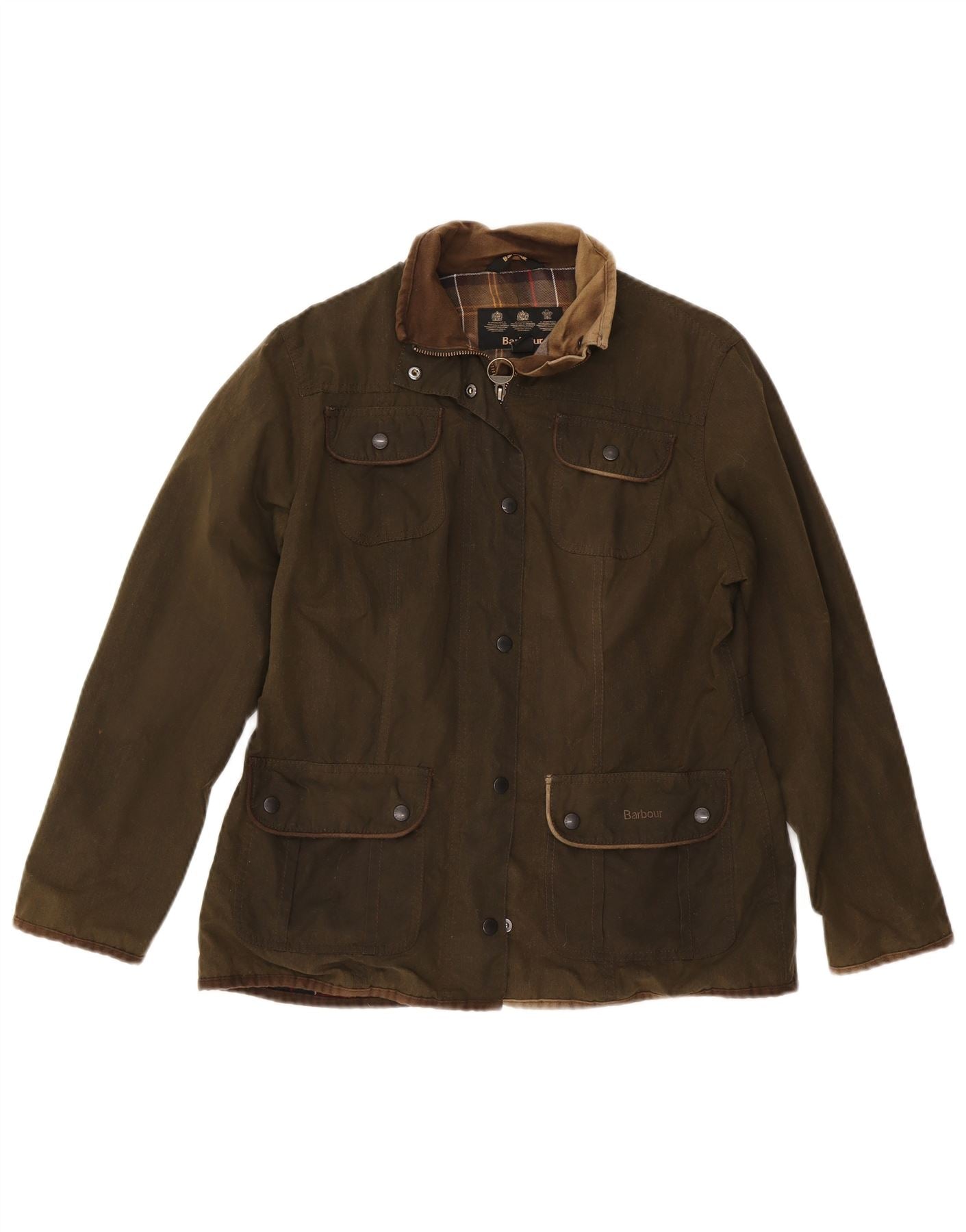 - Descrição da IA: Esta jaqueta feminina de algodão encerado Barbour é confeccionada em tecido de cera cáqui durável. Possui decote clássico com gola e mangas compridas. O ajuste regular garante um uso confortável. Um fecho de correr completo é complementado por detalhes em botões. Bolsos práticos acrescentam utilidade. Um padrão xadrez sutil realça seu estilo clássico.