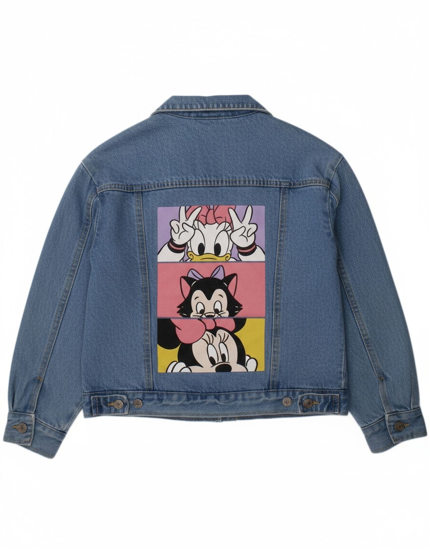 - Descrição da IA: Esta jaqueta jeans para meninas da Disney é confeccionada em jeans de algodão azul resistente. Possui decote clássico com gola e botões frontais completos. Mangas compridas e ajuste regular garantem um uso confortável. O casaco é forrado com poliéster para maior conforto e inclui bolsos práticos. Um gráfico bordado da Minnie Mouse adiciona um toque divertido e icônico às costas.