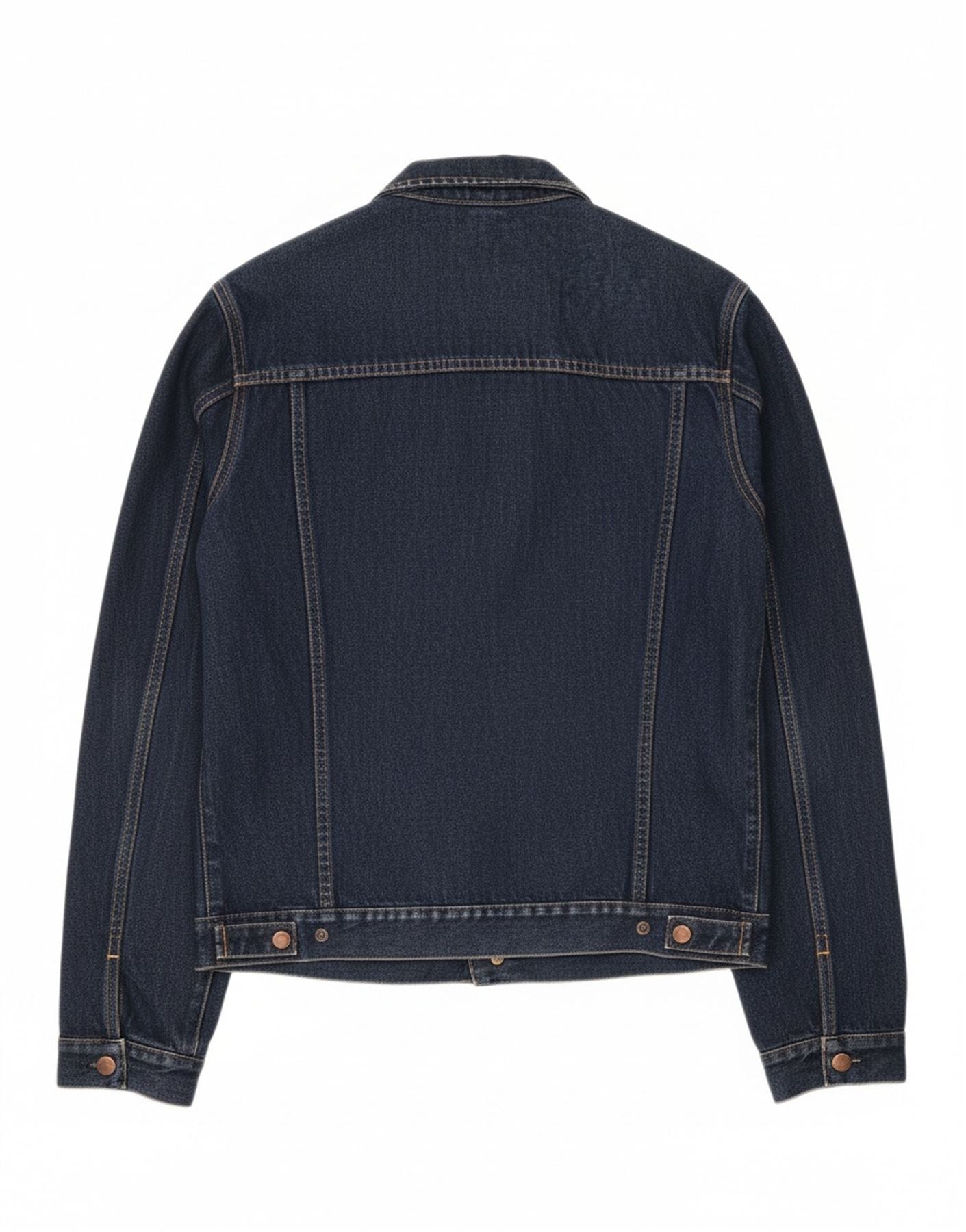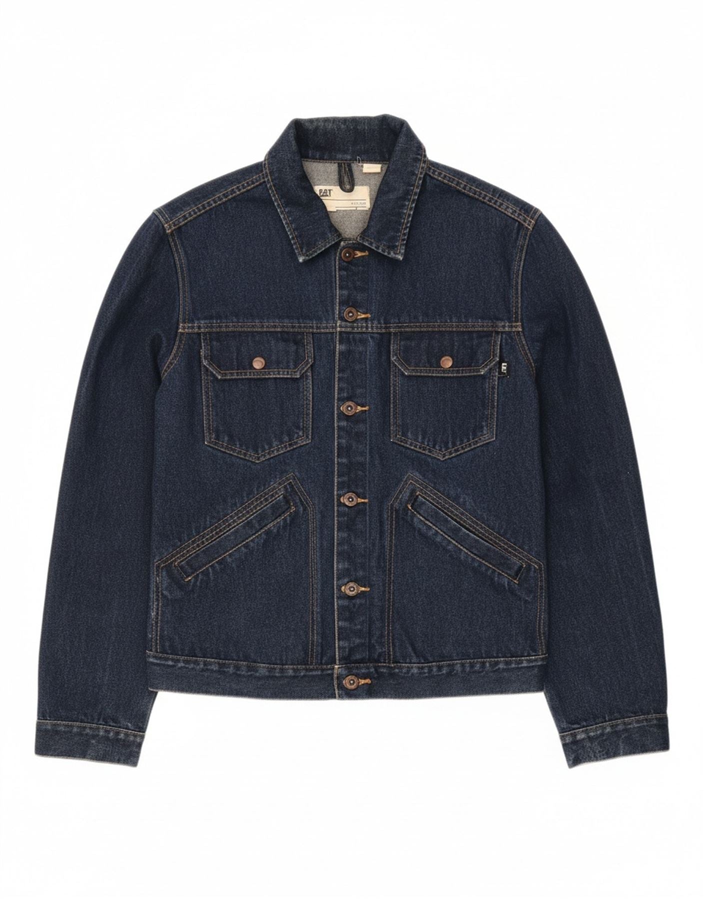 - Descrição da IA: Esta jaqueta jeans masculina CAT é confeccionada em jeans robusto 100% algodão azul marinho. Possui um decote clássico com gola e botões frontais completos para um apelo atemporal. As mangas compridas levam aos punhos abotoados, complementando o corte regular. Bolsos práticos no peito, juntamente com bolsos laterais adicionais, aumentam sua utilidade. Os botões tonais fornecem um destaque sutil. Esta jaqueta durável oferece uma silhueta clássica para uso diário.
