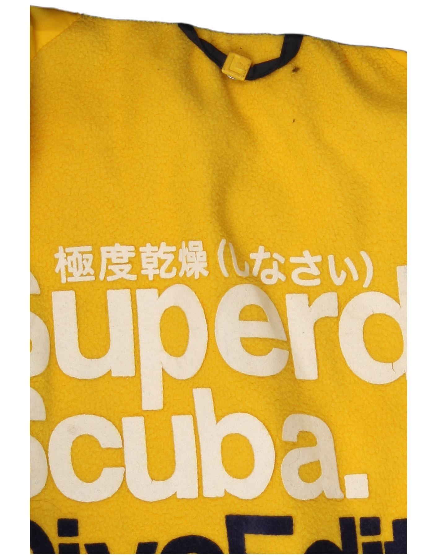 - Condição de IA: Usado | nota: Menor | localização: No forro/capuz interno amarelo, acima do 'd' no logotipo 'Superdry' | tipo: Manchas