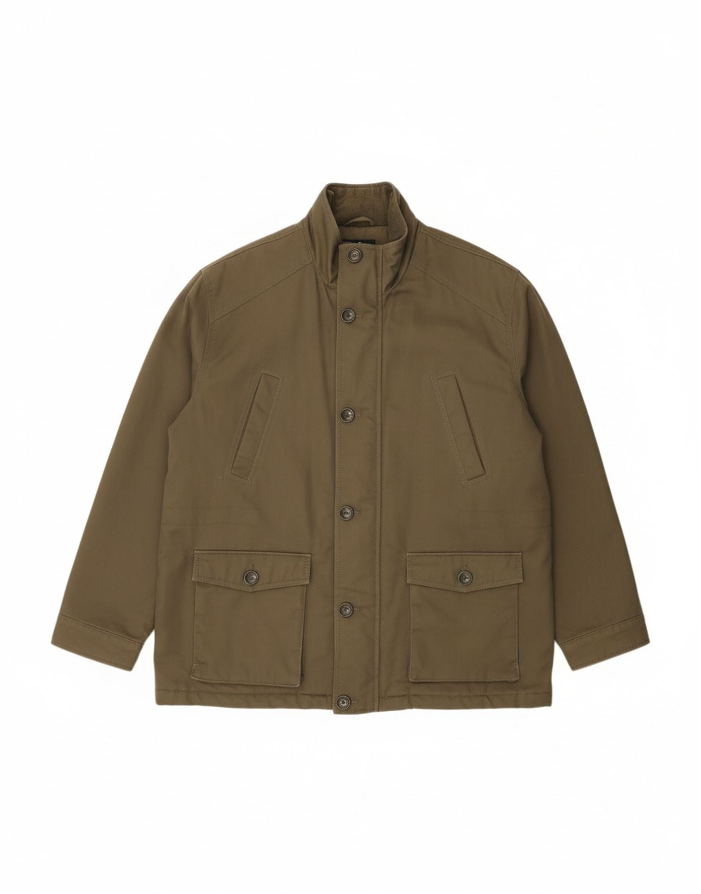 - Descrição da IA: Esta jaqueta militar masculina James Pringle é confeccionada em algodão cáqui robusto. Seu tecido externo oferece uma sensação durável, enquanto o forro acolchoado garante calor. Um decote clássico com gola e mangas compridas emolduram o design. Possui fecho de botão seguro e detalhes práticos de zíper. Vários bolsos adicionam utilidade. O ajuste regular equilibra estrutura com conforto, tornando-o ideal para uso diário.