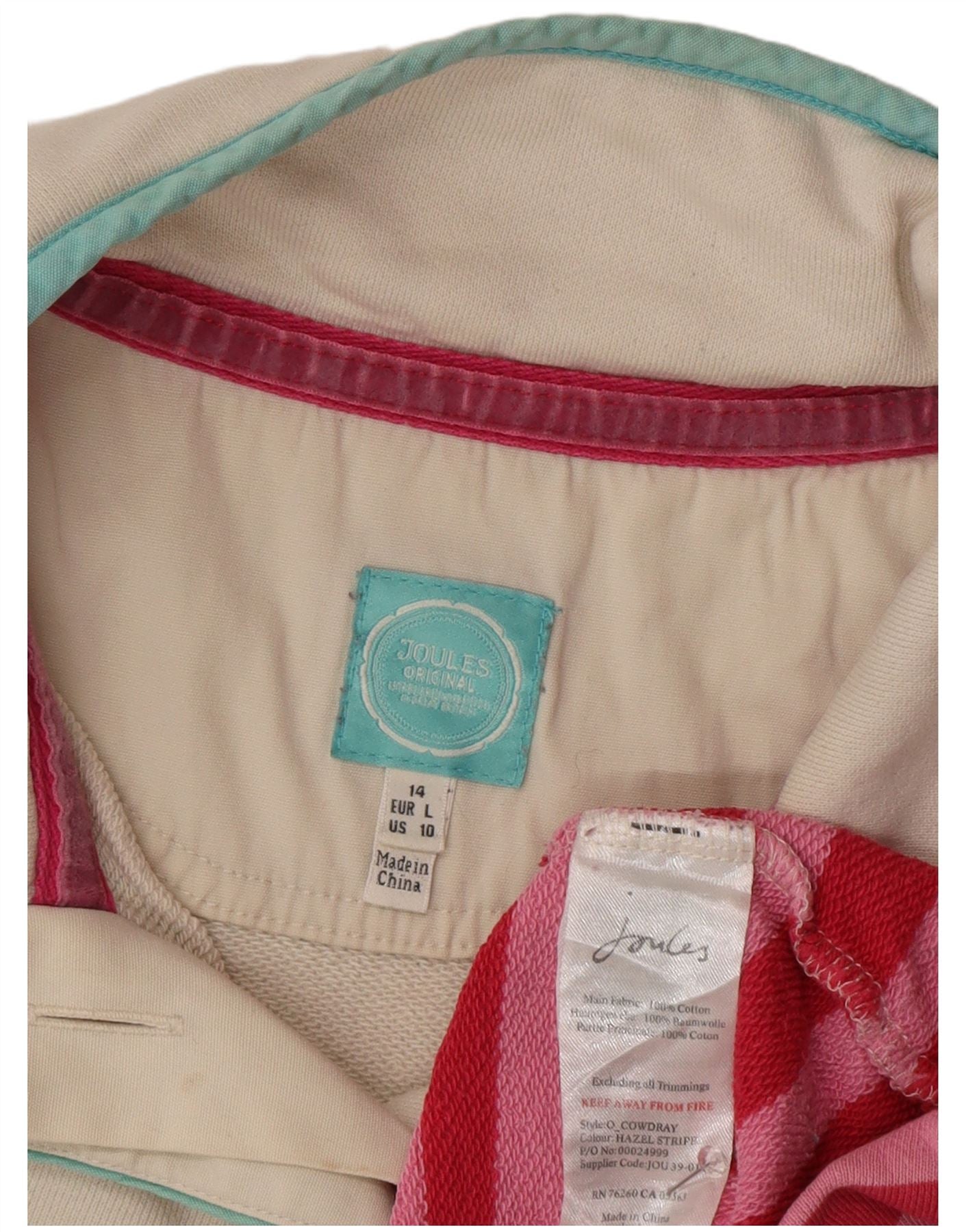 Suéter feminino Joules com gola redonda e botão, Reino Unido 14, grande, rosa, listrado, algodão