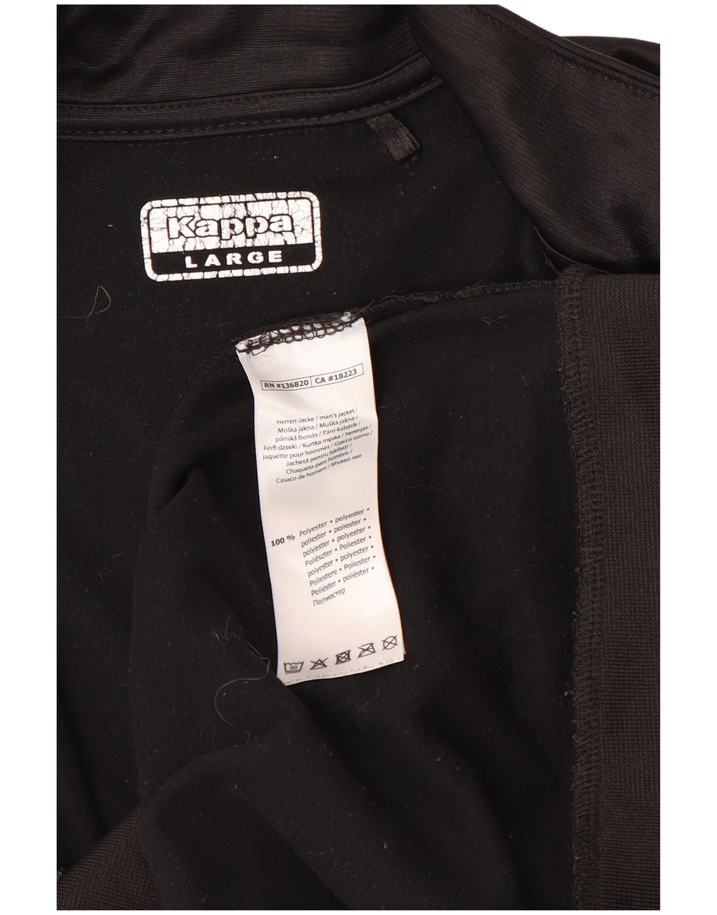 - Descrição da IA: Esta jaqueta masculina Kappa é confeccionada em tecido liso de malha de poliéster preto. Possui decote com gola e fecho de correr completo para uso versátil. Mangas compridas e ajuste regular garantem movimentos confortáveis. Logotipos Kappa brancos proeminentes adornam as mangas e o peito, adicionando um toque esportivo distinto. Bolsos práticos completam o design, oferecendo um estilo funcional.