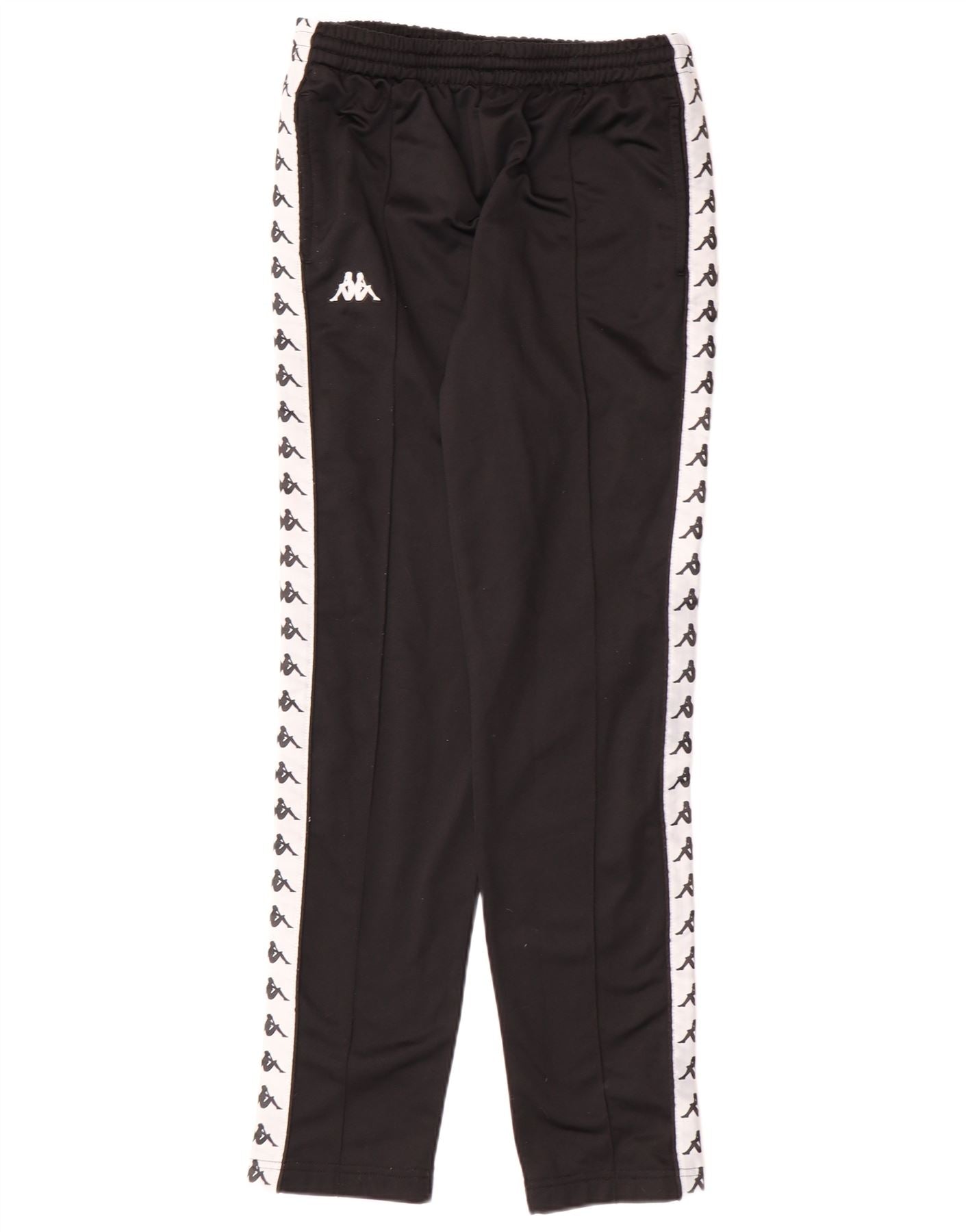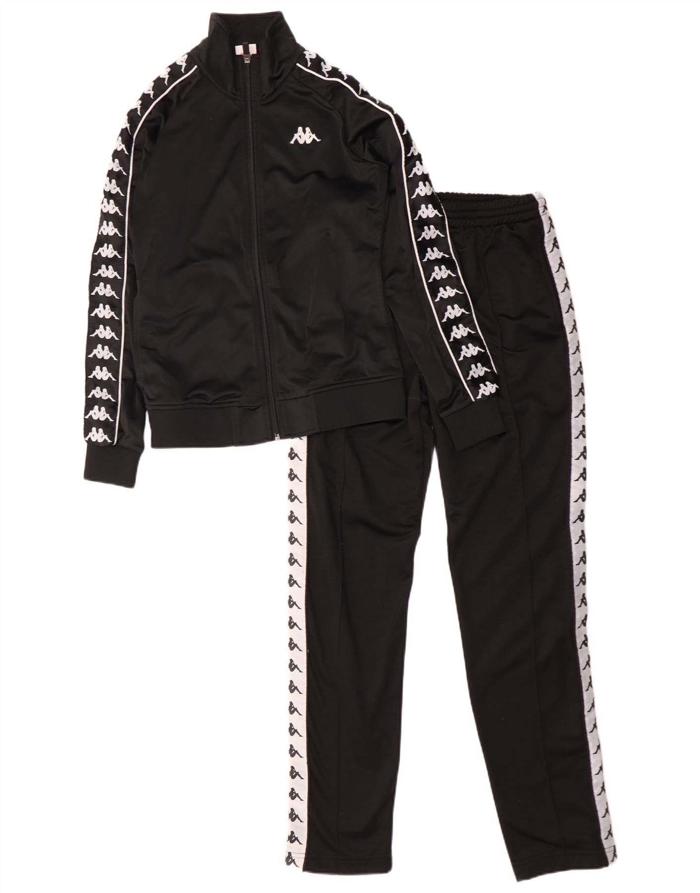 - Descrição da IA: Este agasalho feminino Kappa é confeccionado em jersey de poliéster preto liso. A jaqueta de gola possui fecho de correr completo e mangas compridas. Tanto a jaqueta quanto as calças apresentam detalhes distintos da fita do logotipo nas laterais. As calças têm cintura elástica para maior conforto e bolsos práticos. Este fato de treino regular oferece um estilo desportivo clássico.