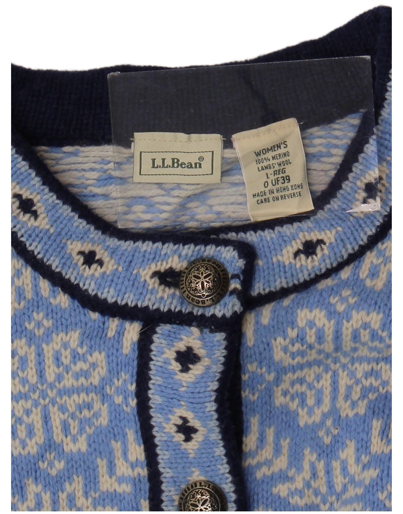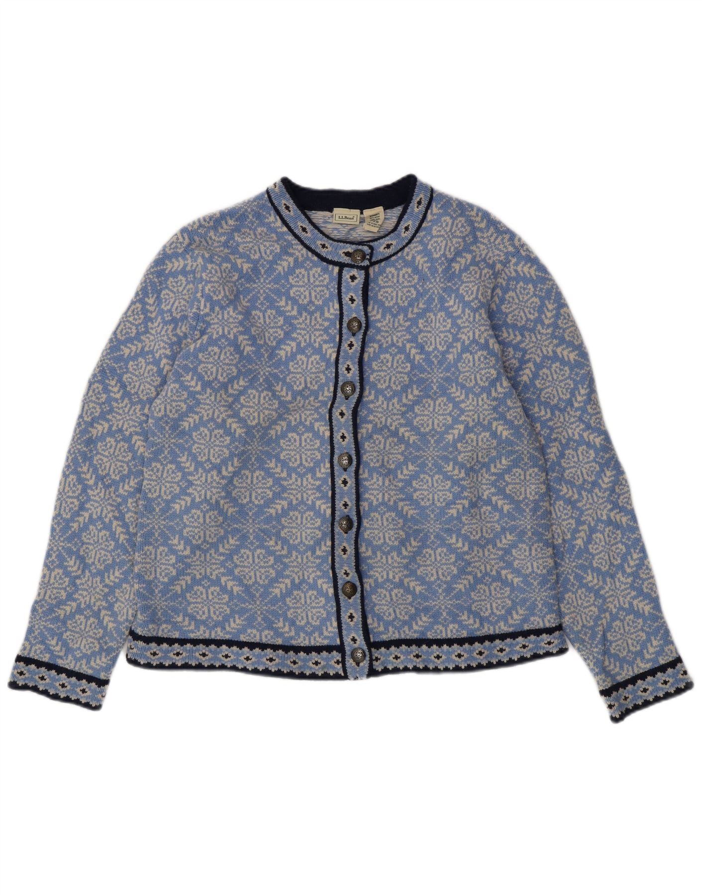 Suéter cardigã feminino L.L.BEAN UK 16 grande azul Fair Isle Merino lã
