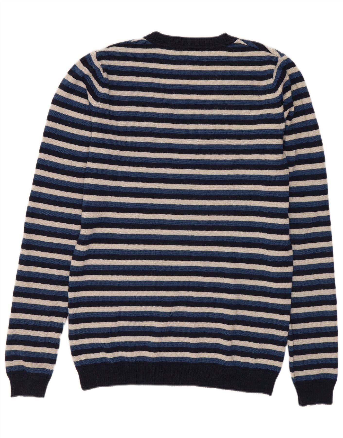 Suéter feminino Lacoste com decote em V tamanho 38 lã listrada azul marinho médio