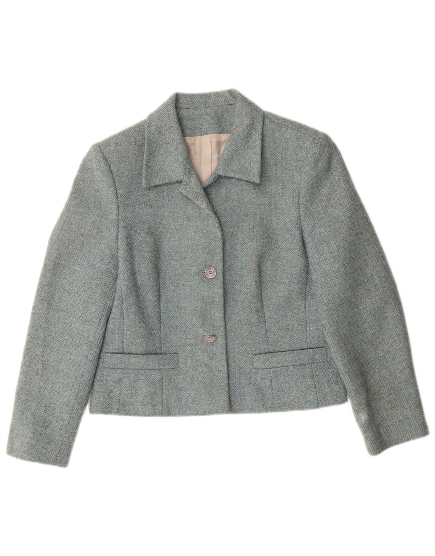 LAURA ASHLEY Jaqueta blazer feminina cropped com 3 botões Reino Unido 12 lã azul médio