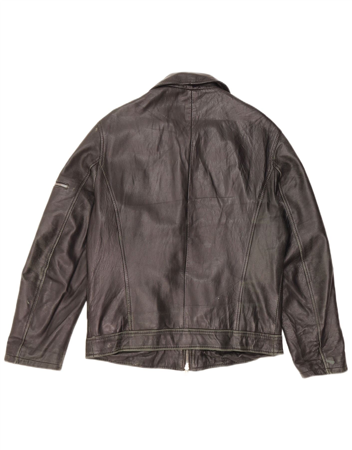 • Descrição da IA: Esta jaqueta de couro vintage masculina é confeccionada em couro preto genuíno, oferecendo um acabamento clássico e durável. Possui decote com gola e mangas compridas. O fecho de correr completo desce pela frente. Um ajuste regular garante um uso confortável. Bolsos práticos estão incluídos. A jaqueta é totalmente forrada para maior conforto e calor. Este estilo clássico é versátil e atemporal.