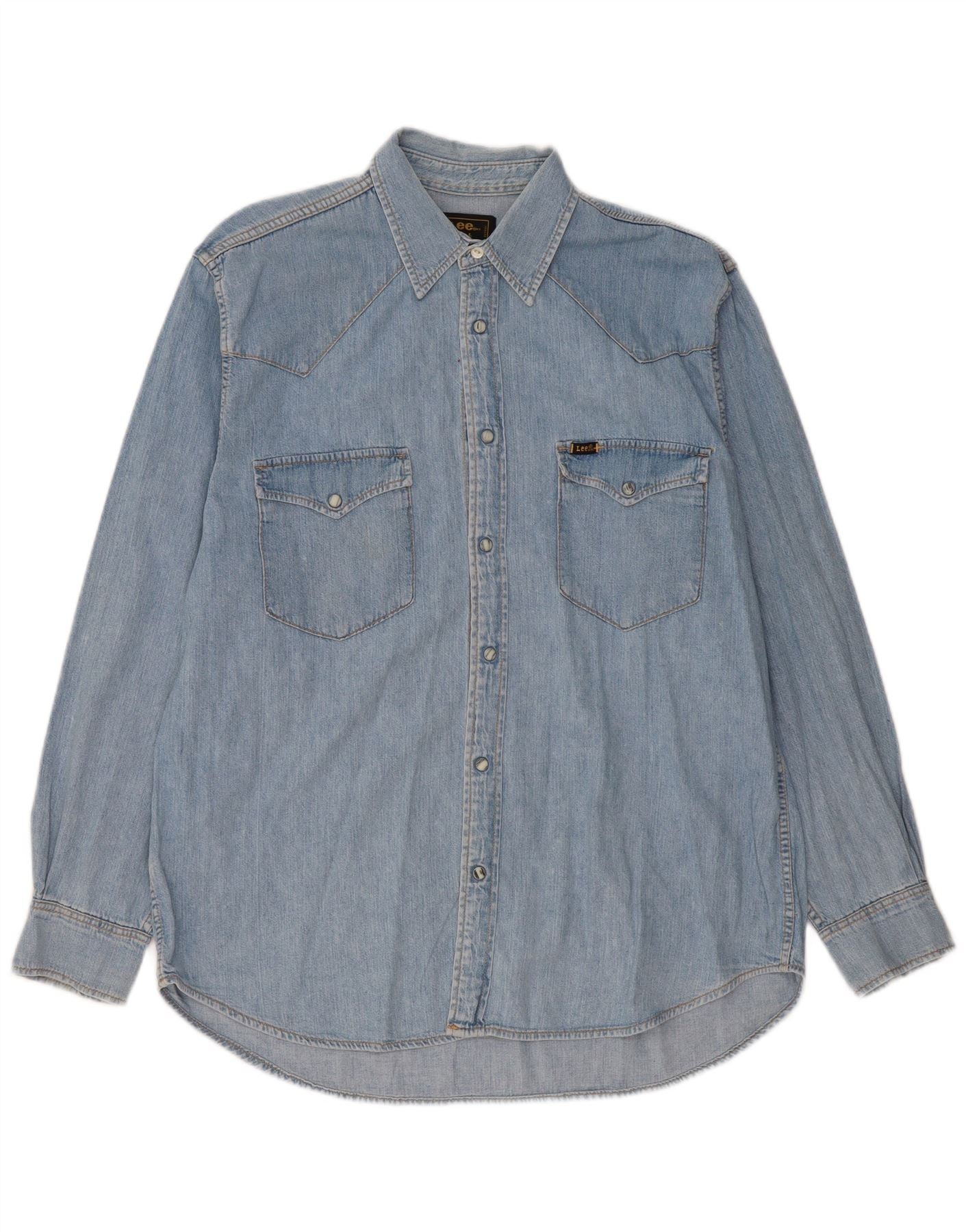 - Descrição da IA: Esta camisa jeans masculina Lee é confeccionada em jeans 100% algodão em uma clássica lavagem azul. Possui decote com gola e mangas compridas. O botão frontal e o ajuste regular oferecem um apelo atemporal. Bolsos no peito de estilo ocidental com fecho de botão acrescentam detalhes autênticos. Um logotipo sutil da marca completa o design, perfeito para um visual casual, mas refinado.