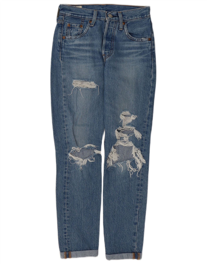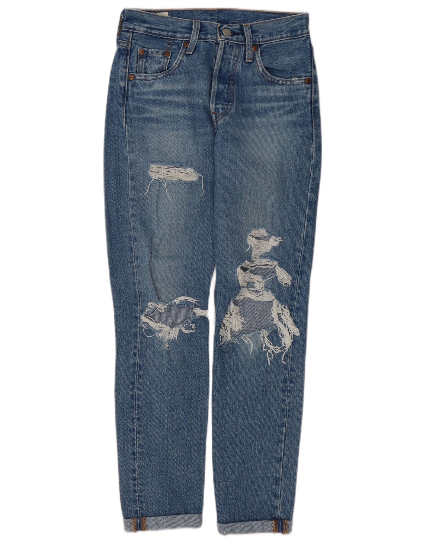 LEVI'S feminino 501 jeans retos desgastados W23 L28 algodão azul