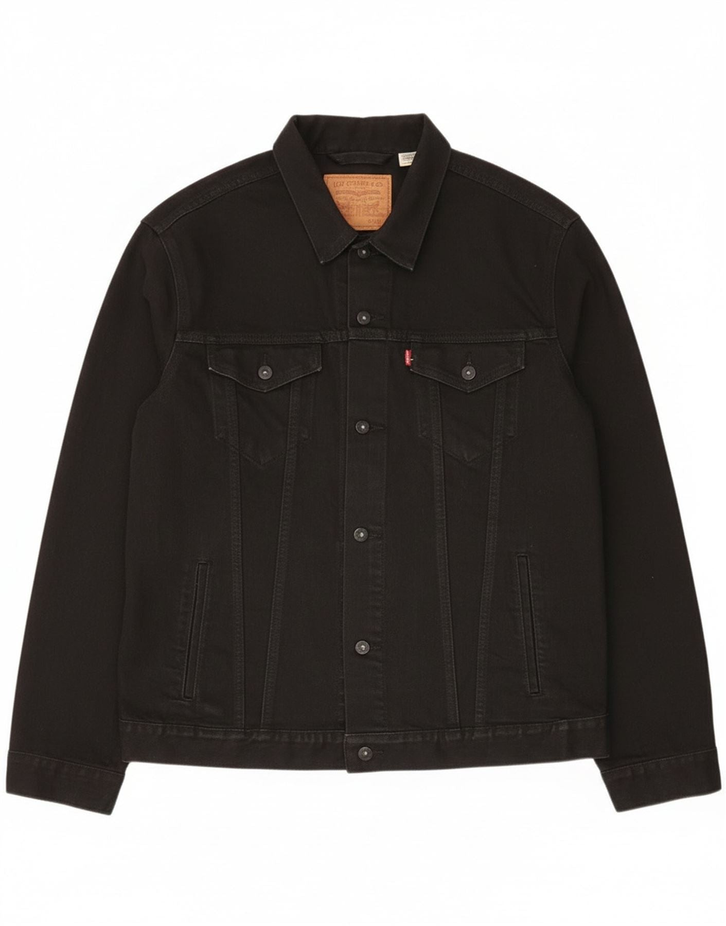 - Descrição da IA: Esta jaqueta jeans masculina Levi's é confeccionada em uma mistura robusta de algodão preto com leve elasticidade. Possui decote clássico com gola e botões frontais completos com cinco botões em tons. Mangas compridas e ajuste regular garantem um uso confortável. Bolsos com aba no peito e bolsos laterais proporcionam armazenamento prático. Um logotipo sutil da marca adiciona um toque autêntico a este estilo caminhoneiro atemporal.