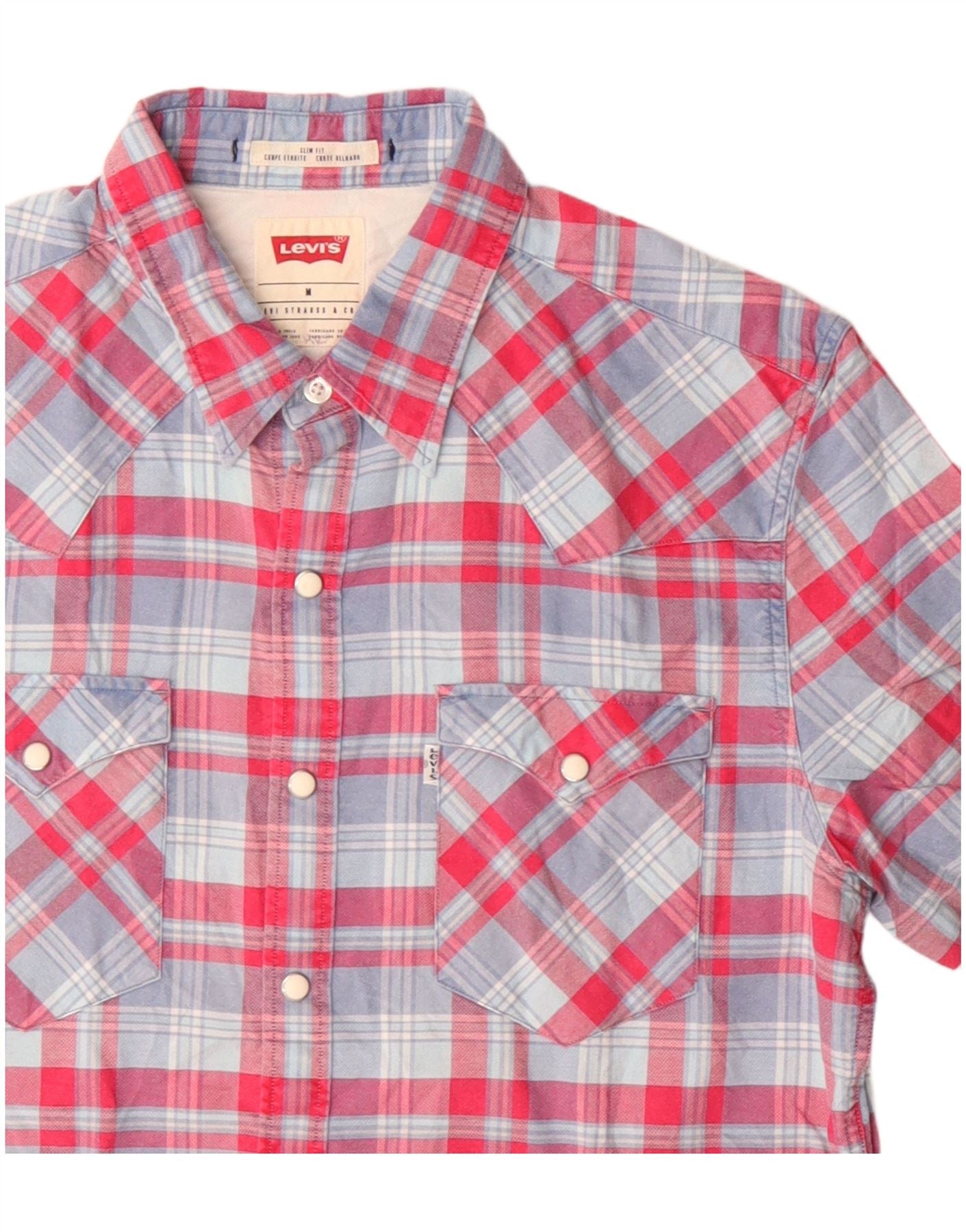 - Descrição da IA: Esta camisa ocidental masculina da Levi's é confeccionada em tecido 100% algodão. Possui um padrão xadrez vermelho e azul vibrante. O decote com gola e as mangas curtas oferecem um visual clássico. Os fechos de pressão percorrem a frente e os bolsos do peito. Um ajuste regular garante um uso confortável. Esta camisa combina o estilo ocidental tradicional com uma silhueta moderna e justa.